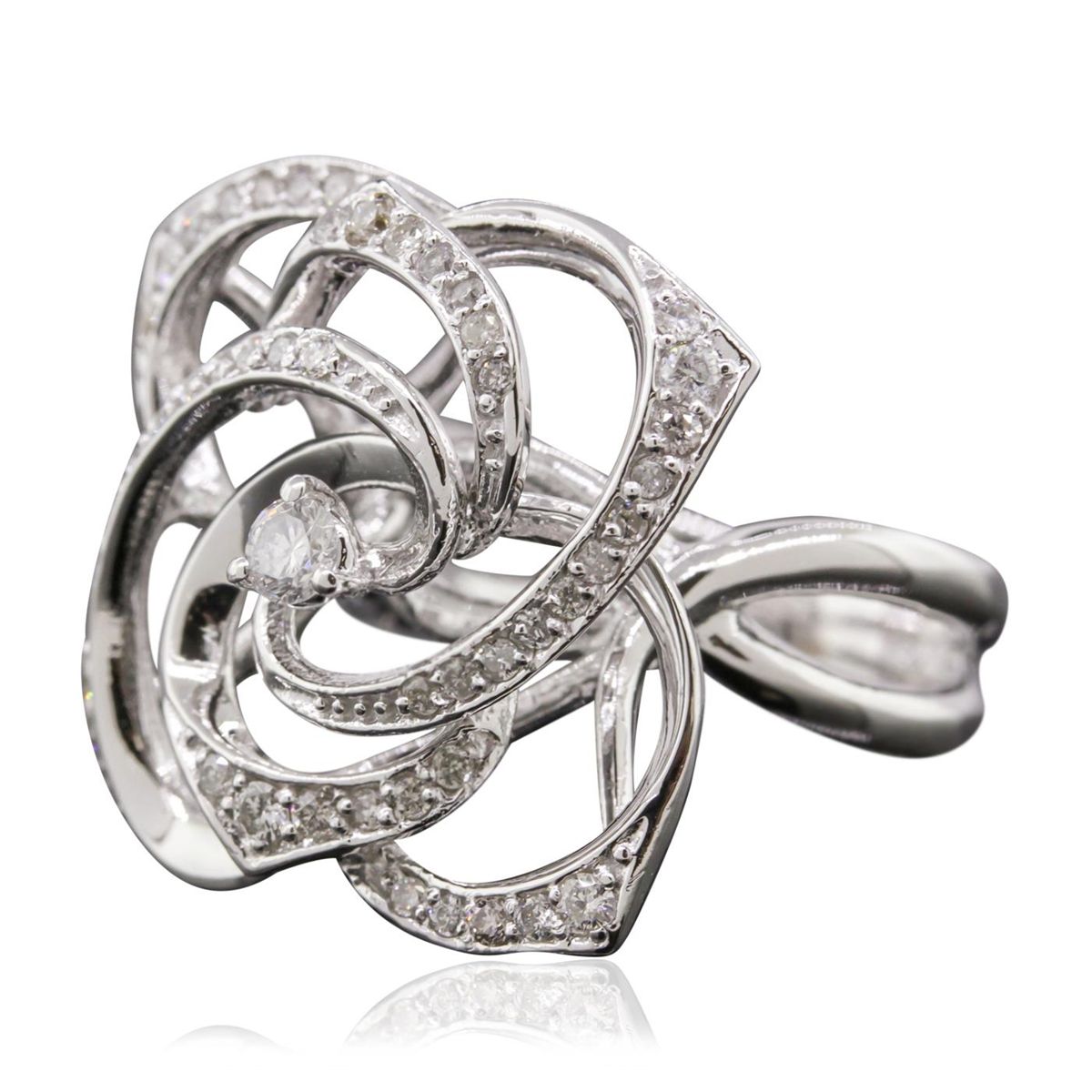 One electronically tested 14KT white gold Ladies combination cast & assembled ring with a bright polish finish. Condition is new. Identified with markings of "K14". Containing: One prong set round brilliant cut diamond, measuring 3.00 - 3.00 x 1.80mm (depth est.) approximate weight of 0.10ct. Clarity: I-1. Color: H, Cut is Good. Forty prong set round brilliant cut diamonds, measuring 1.50 - 1.50 x 0.90mm (depth est.) approximate. Total Weight of 40 Stones = 0.49ct. Clarity: SI-2 to I-1. Color: I - J, Cut is Good. All grading of diamonds and colored gemstones in this piece of jewelry are graded in the mounting, unless otherwise stated. Total Weight of Diamonds 0.59ct. Total Weight of Ring 9.70 grams. GGL Appraised at $5,040.00.