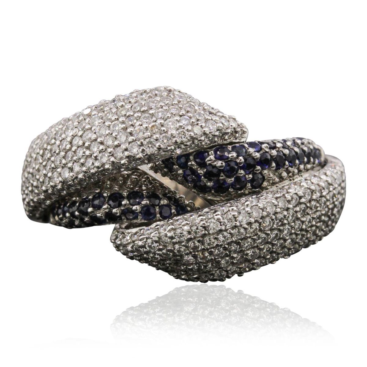 One electronically tested 14KT white gold ladies cast sapphire and diamond ring with a bright polish finish. Condition is new, good workmanship. The ring features diagonal ribbons of sapphires and diamonds, completed by a four and one-half millimeter wide band. Identified with markings of "14K". Containing: Forty-nine pav‚ set round brilliant cut natural blue sapphires, measuring 1.40 - 1.30 x 0.88 mm, approximate. Total Weight of 0.59ct., clarity is eye clean, type II, dark, moderately strong, blue color, (GIA B 7/4), cut is good. Transmitting light with no distortion, transparent. Color grade is an average for the group. Graded in the setting. Two Hundred Sixty-Two pav‚ set round brilliant cut diamonds, measuring 1.20 - 1.00 x 0.66mm (depth est.) approximate. Total Weight of 262 Stones = 1.35ct. Graded in the setting. Clarity: VS-1 to VS-2. Color: G - I. Total Weight of Colored Stones 0.59ct. Total Weight of Diamonds 1.35ct. Total Weight of Ring 12.32 grams. AIG Appraised at $9,890.00.