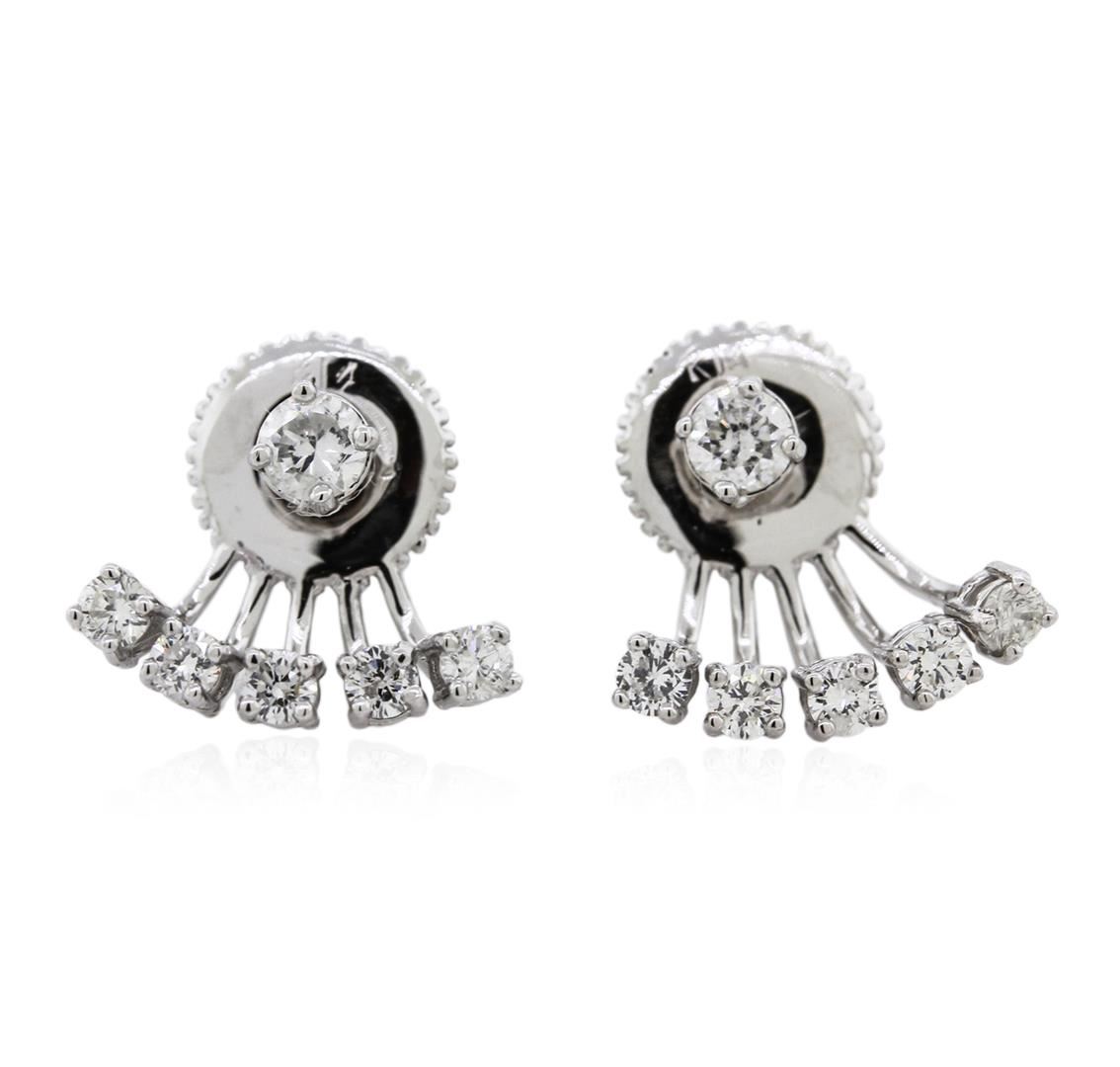 One pair electronically tested 14KT white gold ladies cast diamond earrings with a bright polish finish. Identified with markings of "14K". Condition is new. Containing: Two prong set round brilliant cut diamonds, measuring 3.00 - 3.00 x 1.80mm (depth est.) approximate total weight of 2 Stones = 0.23ct. Clarity: SI-1 to SI-2. Color: I - J, Cut is Good. Ten prong set round brilliant cut diamonds, measuring 2.00 - 2.00 x 1.20mm (depth est.) approximate total weight of 10 Stones = 0.37ct. Clarity: SI-1 to SI-2. Color: I - J, Cut is Good. All diamonds are graded in the mounting, unless otherwise stated. Total Weight of Diamonds 0.60ct. Total Weight of Earrings 4.00 grams. GGL Appraised at $2,020.00.