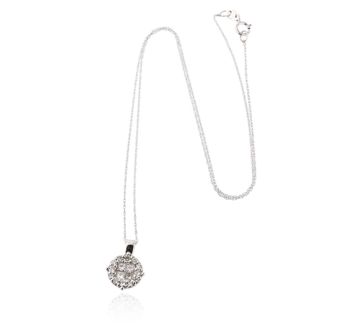 One pendant with chain featuring: 14KT white gold weighing 2.6 grams containing princess and round cut diamonds weighing a total of 0.60ct.