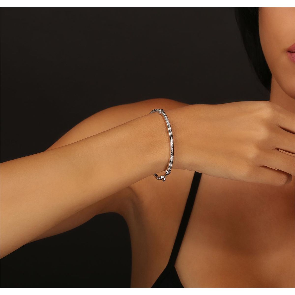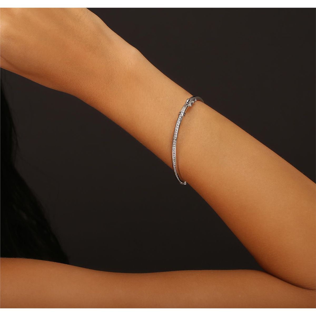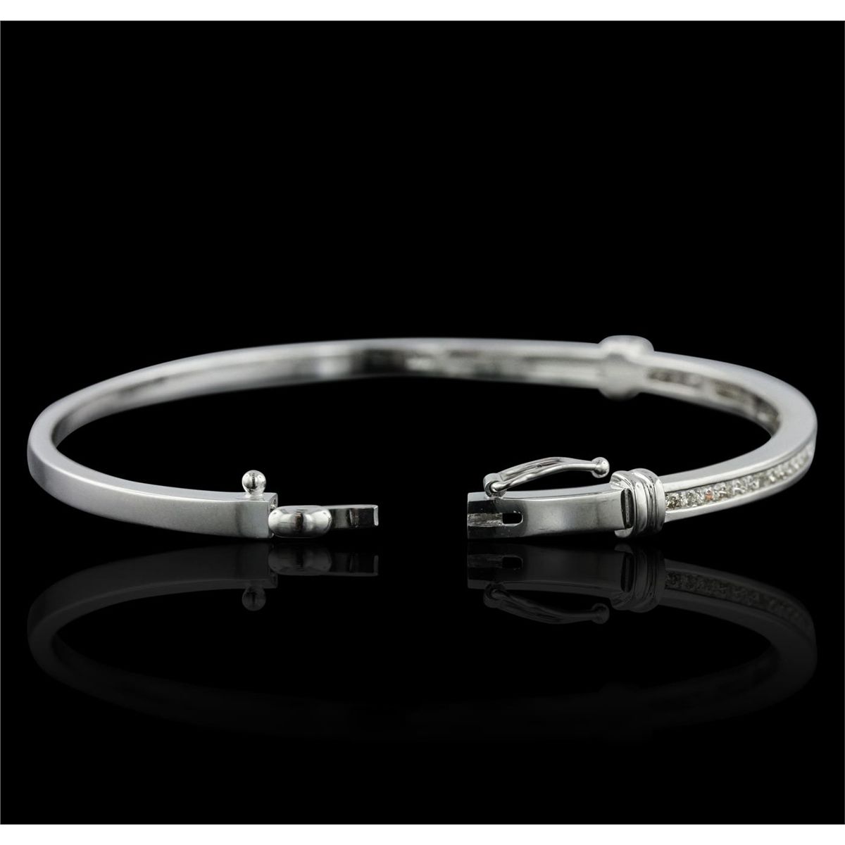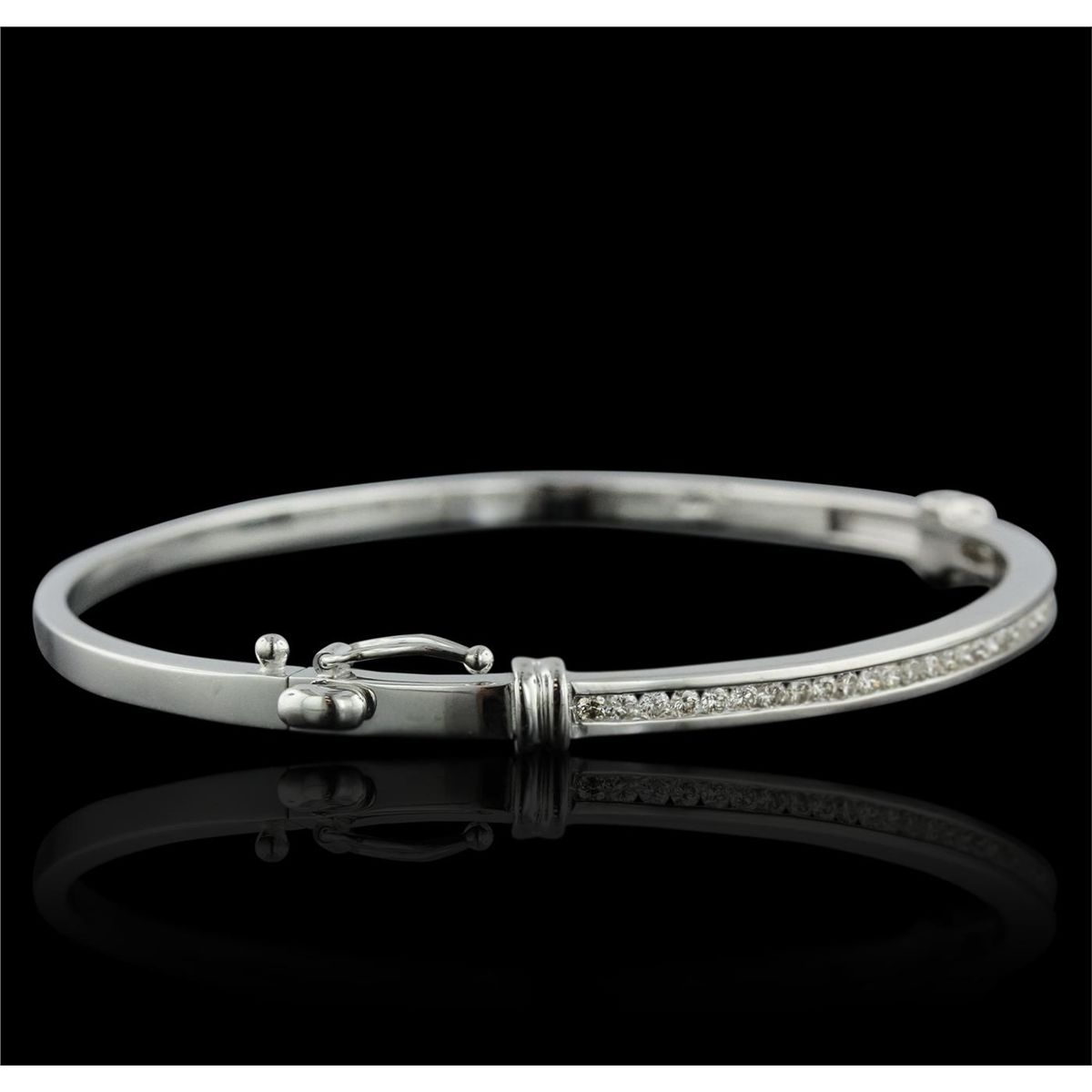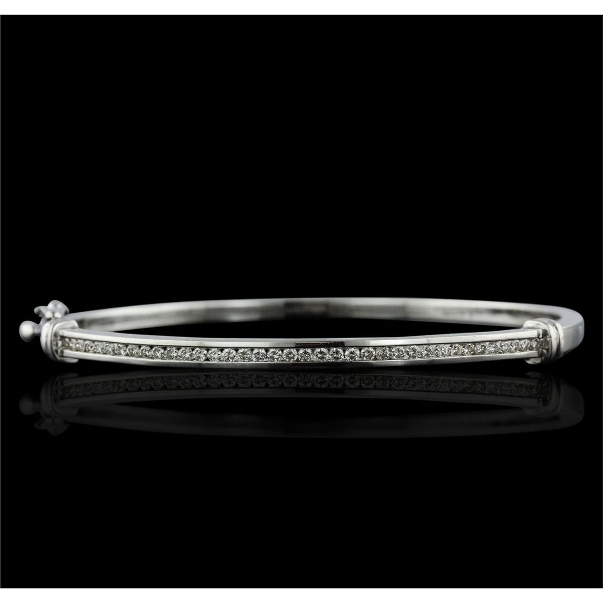 One electronically tested 14KT white gold ladies cast & assembled diamond bangle bracelet with a bright polish finish. Condition is new, good workmanship. Six and one-quarter inch length diamond set hinged bangle bracelet terminating in a concealed clasp with safety. Identified with markings of "14K". Containing: Thirty-Seven channel set round brilliant cut diamonds, measuring 1.60 - 1.50 x 0.93mm (depth est.) approximate. Total Weight of 37 Stones = 0.60ct. Graded in the setting. Clarity: VS-2 to SI-2. Color: G - I. Total Weight of Diamonds 0.60ct. Total Weight of Bangle Bracelet 12.90 grams. AIG Appraised at $4,600.00.