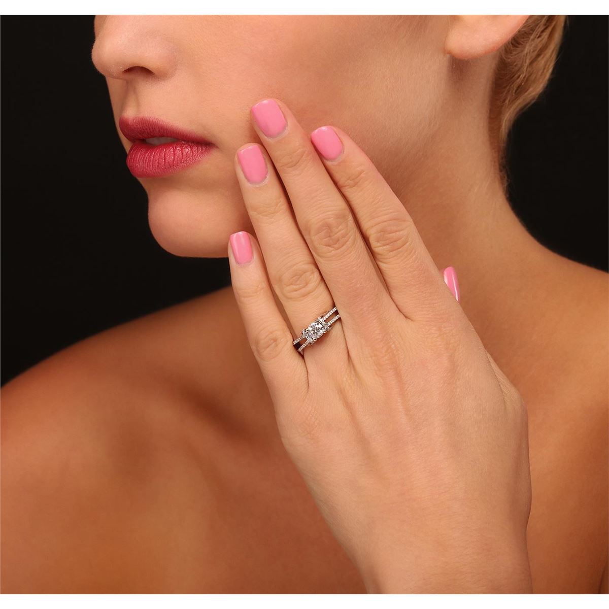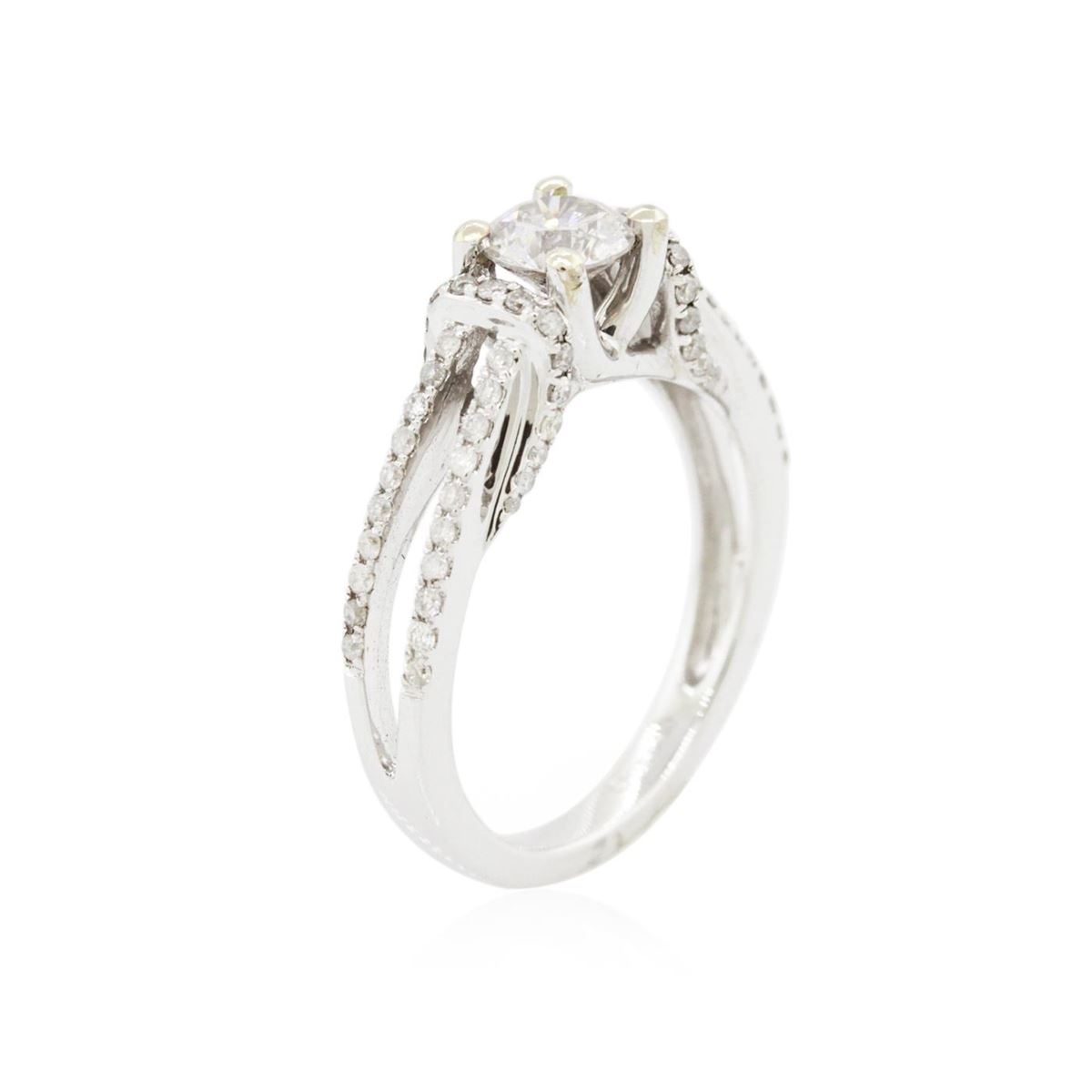 One electronically tested 14KT white gold Ladies combination cast & assembled engagement ring with a bright polish finish. Condition is new. Identified with markings of "14K". Containing: One prong set round brilliant cut diamond, measuring 5.50 - 5.50 x 3.30mm (depth est.) approximate weight of 0.61ct. Clarity: I-1. Color: G, Cut is Good. Seventy-Six prong set round brilliant cut diamonds, measuring 1.00 - 1.00 x 0.60mm (depth est.) approximate. Total Weight of 76 Stones = 0.27ct. Clarity: I-2 to I-3. Color: G - H, Cut is Fair. Total Weight of Diamonds 0.88ct. Total Weight of Ring 4.40 grams. GGL Appraised at $6,430.00.