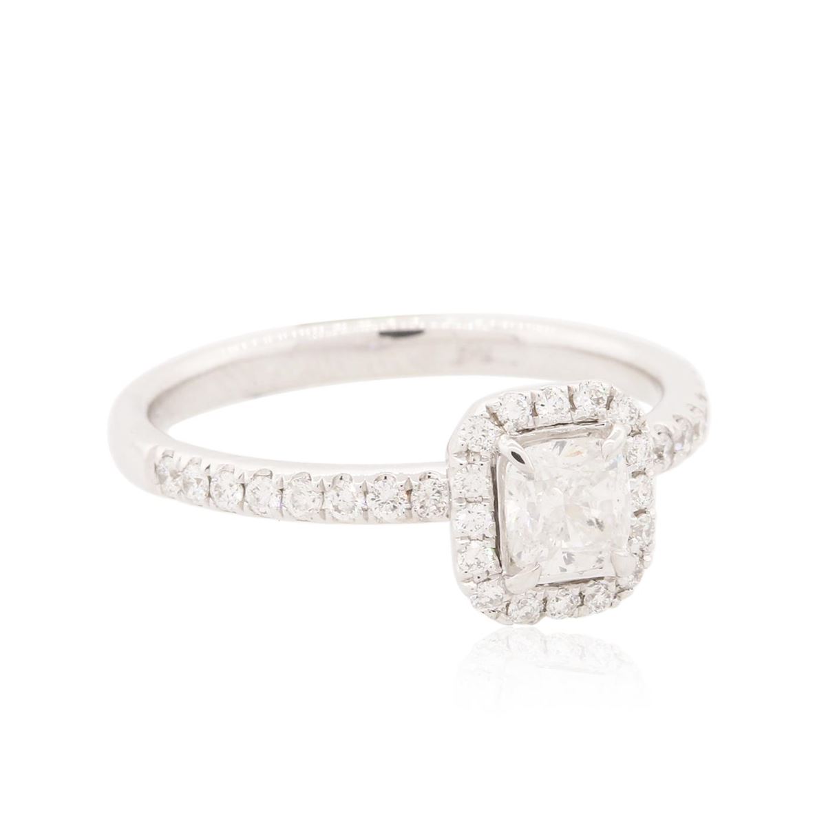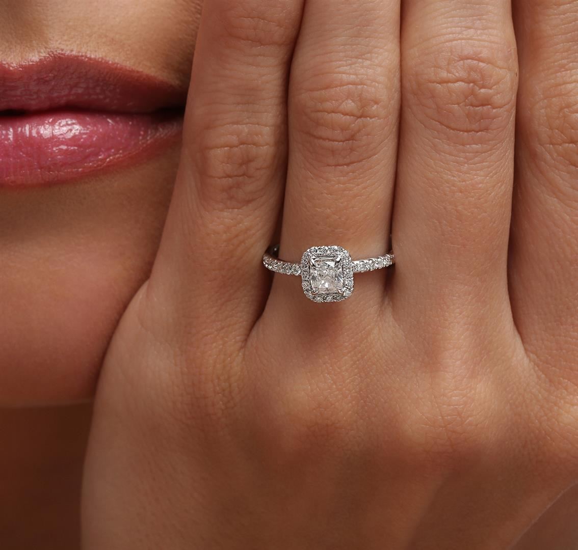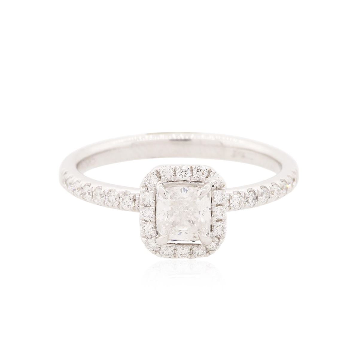 One ring featuring: 14KT white gold weighing 2.80 grams containing one prong set cushion cut center diamond with a total weight of 0.34ct and prong set round diamonds with a total weight of 0.27ct.