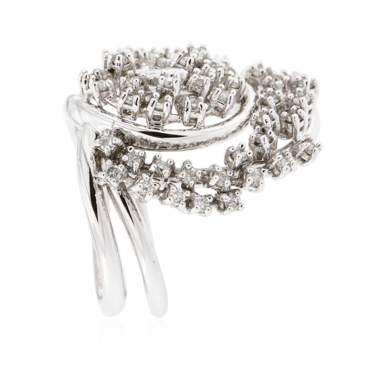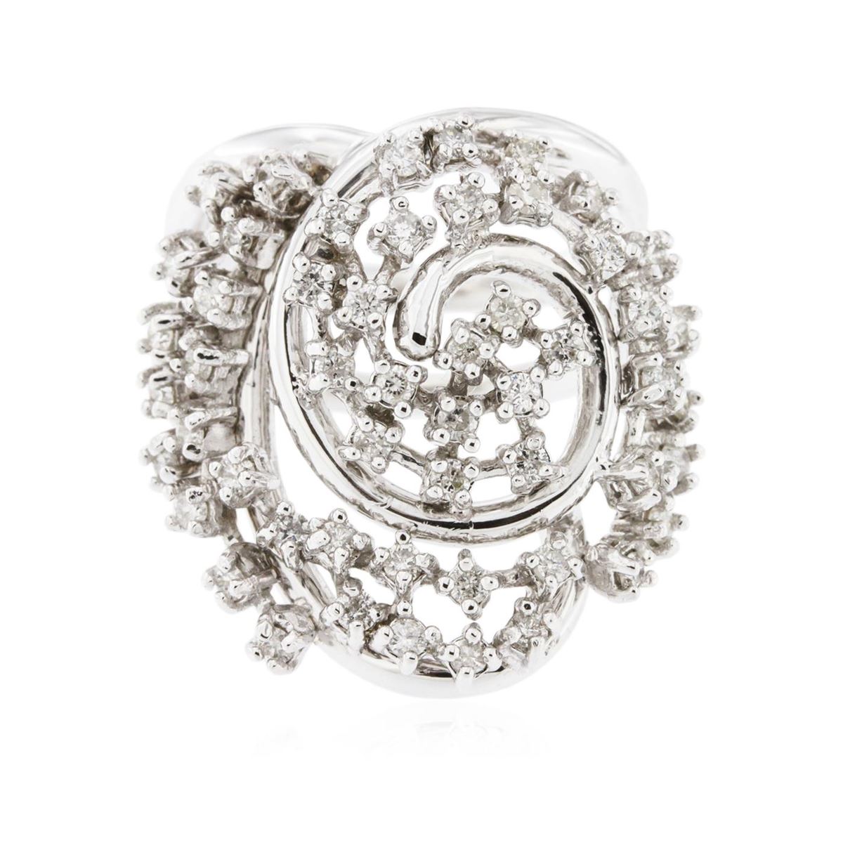 One electronically tested 14KT white gold ladies cast diamond ring with a bright polish finish. Identified with markings of "K14". Condition is new. Containing: Fifty prong set round brilliant cut diamonds, measuring 1.50 - 1.50 x 0.90mm (depth est.) approximate total weight of 50 Stones = 0.62ct. Clarity: SI-2 to I-1. Color: J - K, Cut is Good. All diamonds are graded in the mounting, unless otherwise stated. Total Weight of Diamonds 0.62ct. Total Weight of Ring 12.30 grams. GGL Appraised at $4,520.00.