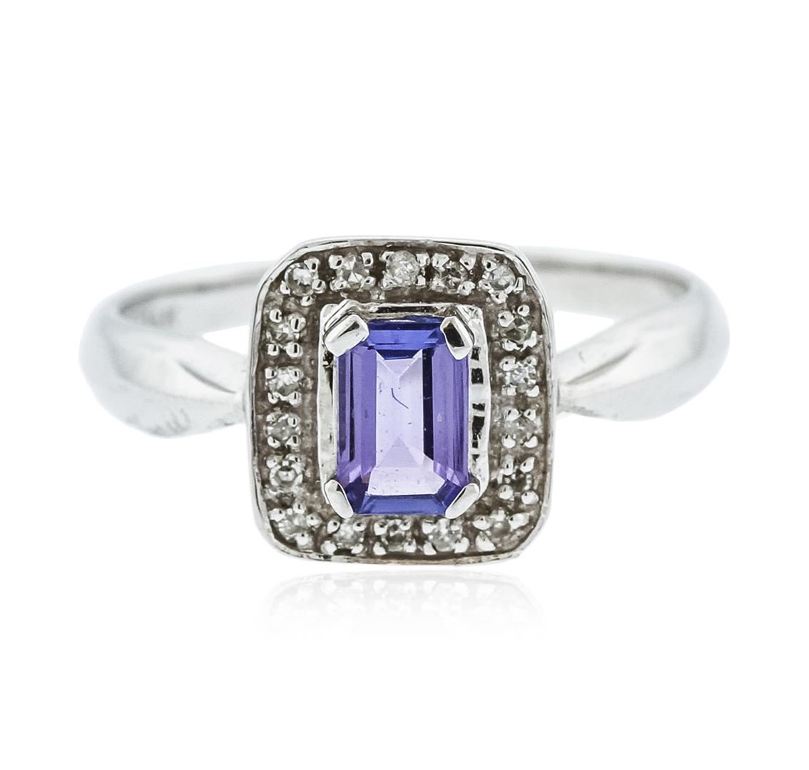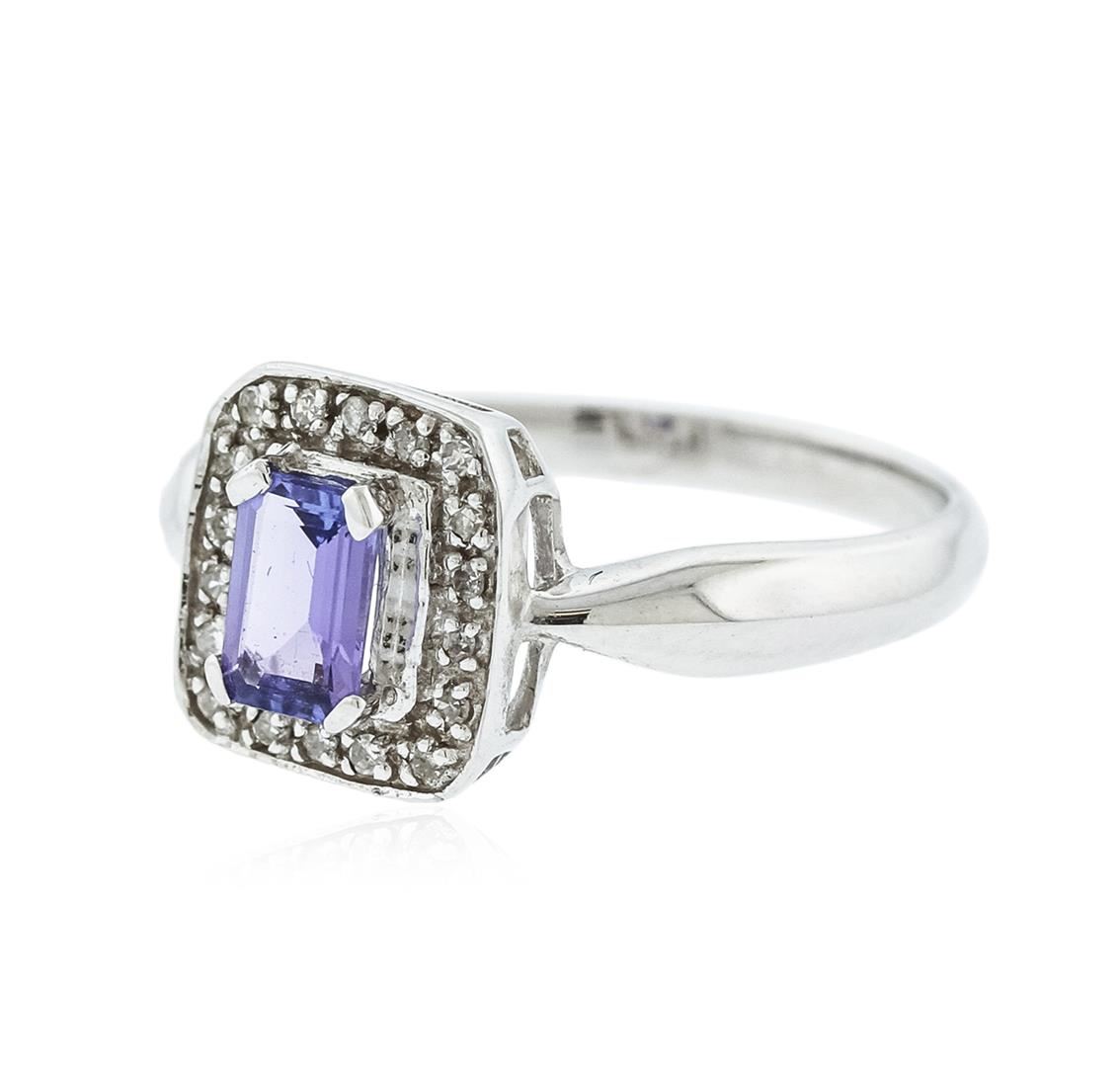 One electronically tested 14KT white gold ladies cast tanzanite and diamond ring with a bright polish finish. Identified with markings of "14K". Condition is new. Containing: One prong set emerald standard step cut natural tanzanite, measuring 5.90 x 4.30 x 2.80mm, approximate weight of 0.64ct., clarity is eye clean, type I, medium light, slightly grayish, violet color, (GIA V 4/2), cut is good. Eighteen prong set single cut diamonds, measuring 1.30 - 1.30 x 0.78mm (depth est.) approximate total weight of 18 Stones = 0.14ct. Clarity: I-1 to I-2. Color: I - J. Colored gemstones are presumed to have been subjected to commonly used enhancement processes. All diamonds and colored gemstones are graded in the mounting, unless otherwise stated. Total Weight of Colored Stones 0.64ct. Total Weight of Diamonds 0.14ct. Total Weight of Ring 2.90 grams. GGL Appraised at $1,355.00.