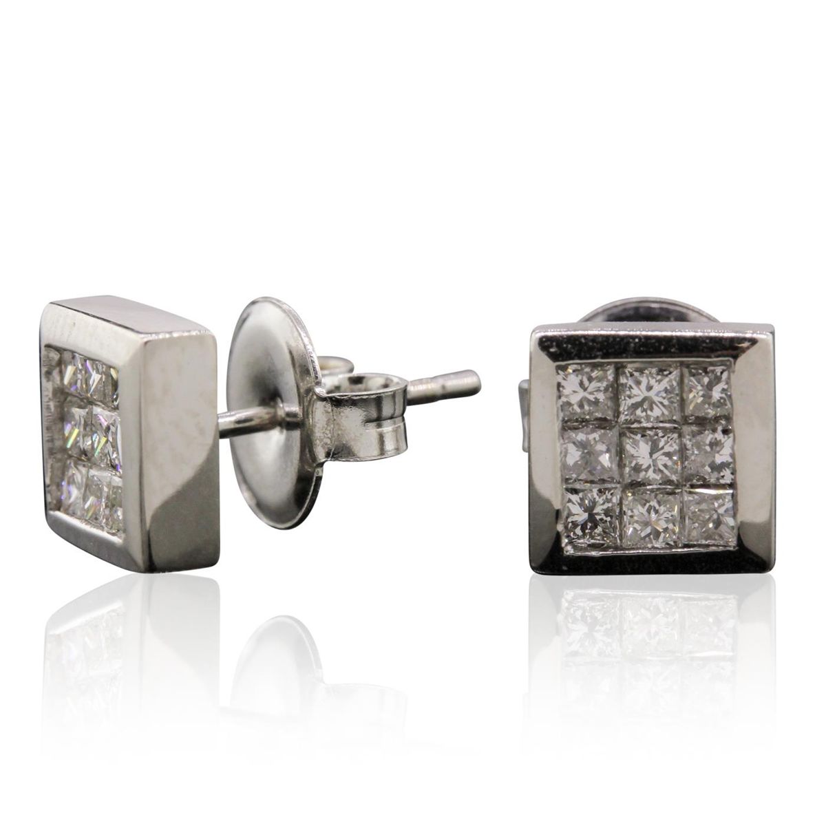 One pair electronically tested 14KT white gold Ladies cast stud earrings with friction posts with a bright polish finish. Condition is new. Containing: Eighteen invisible set princess cut diamonds, measuring 1.80 x 1.80 x 1.35mm (depth est.) approximate. Total Weight of 18 Stones = 0.64ct. Clarity: SI-2 to I-1. Color: I - K, Cut is Good. Total Weight of Diamonds 0.64ct. Total Weight of Earrings 2.80 grams. GGL Appraised at $2,120.00.