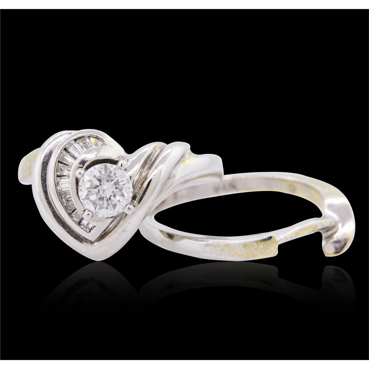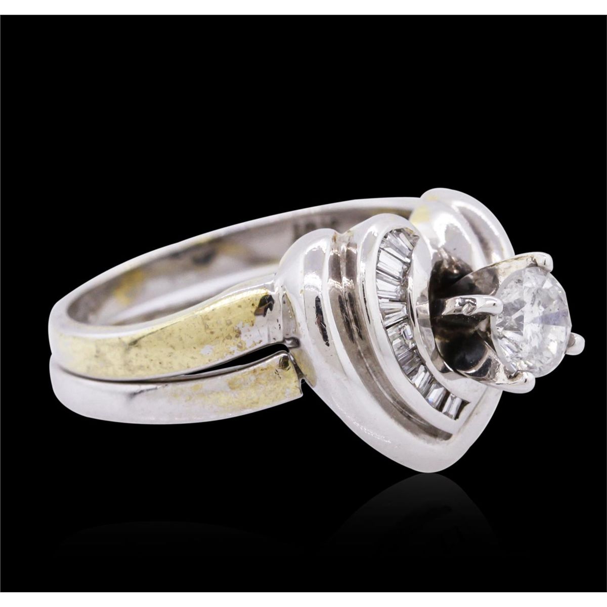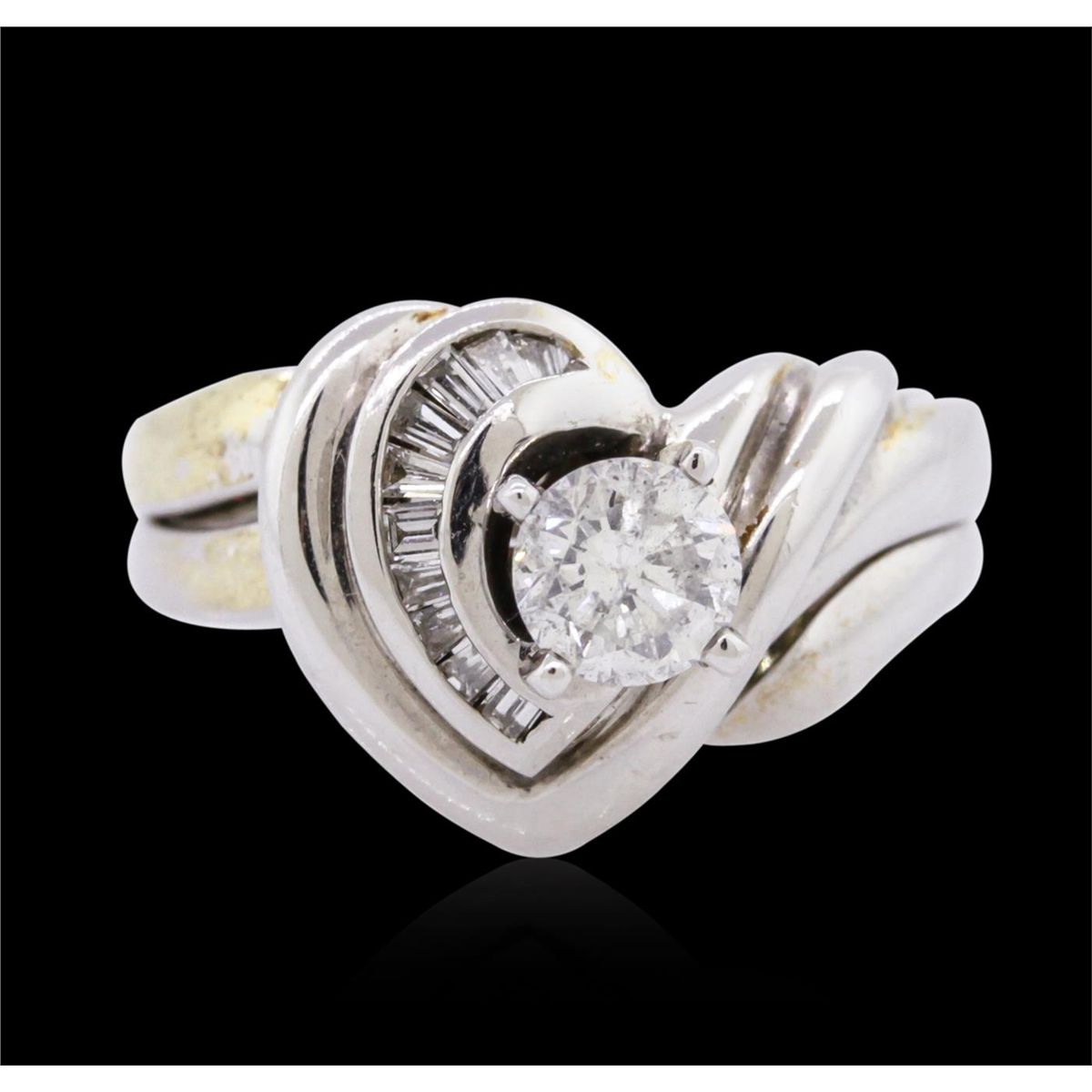 One wedding ring set featuring: 14KT white gold weighing 8.50 grams containing one round diamond center stone with a total weight of 0.55ct and 10 baguette diamonds with a total weight of 0.10cts.