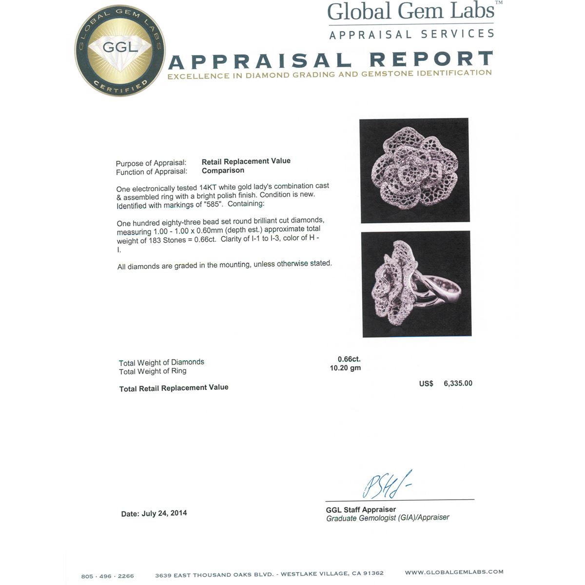 One electronically tested 14KT white gold ladies combination cast & assembled ring with a bright polish finish. Condition is new. Identified with markings of "585". Containing: One Hundred Eighty-Three bead set round brilliant cut diamonds, measuring 1.00 - 1.00 x 0.60mm (depth est.) approximate total weight of 183 Stones = 0.66ct. Clarity: I-1 to I-3. Color: H - I. All diamonds are graded in the mounting, unless otherwise stated. Total Weight of Diamonds 0.66ct. Total Weight of Ring 10.20 grams. GGL Appraised at $6,335.00.