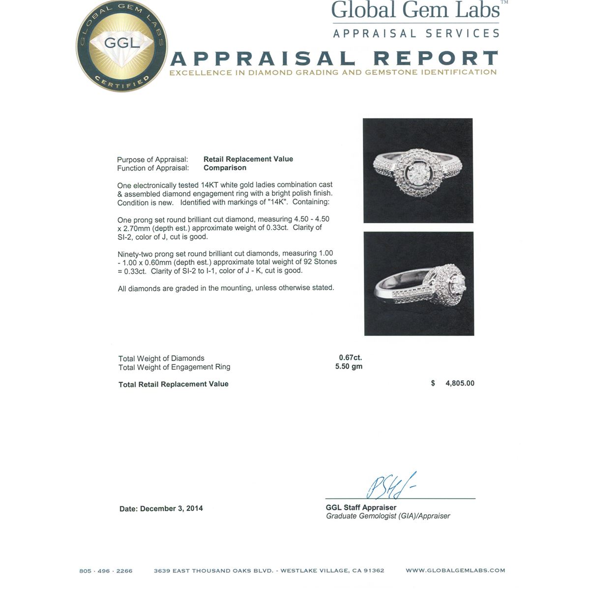 One electronically tested 14KT white gold ladies combination cast & assembled diamond engagement ring with a bright polish finish. Identified with markings of "14K". Condition is new. Containing: One prong set round brilliant cut diamond, measuring 4.50 - 4.50 x 2.70mm (depth est.) approximate weight of 0.33ct. Clarity: SI-2. Color: J, Cut is Good. Ninety-Two prong set round brilliant cut diamonds, measuring 1.00 - 1.00 x 0.60mm (depth est.) approximate total weight of 92 Stones = 0.33ct. Clarity: SI-2 to I-1. Color: J - K, Cut is Good. All diamonds are graded in the mounting, unless otherwise stated. Total Weight of Diamonds 0.67ct. Total Weight of Engagement Ring 5.50 grams. GGL Appraised at $4,805.00.