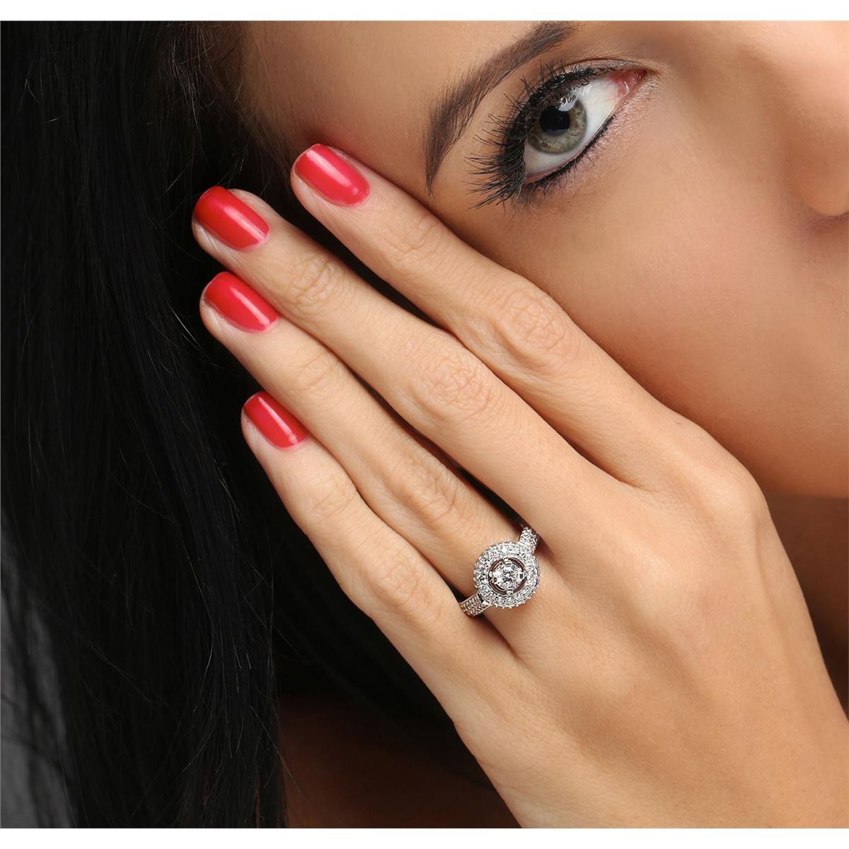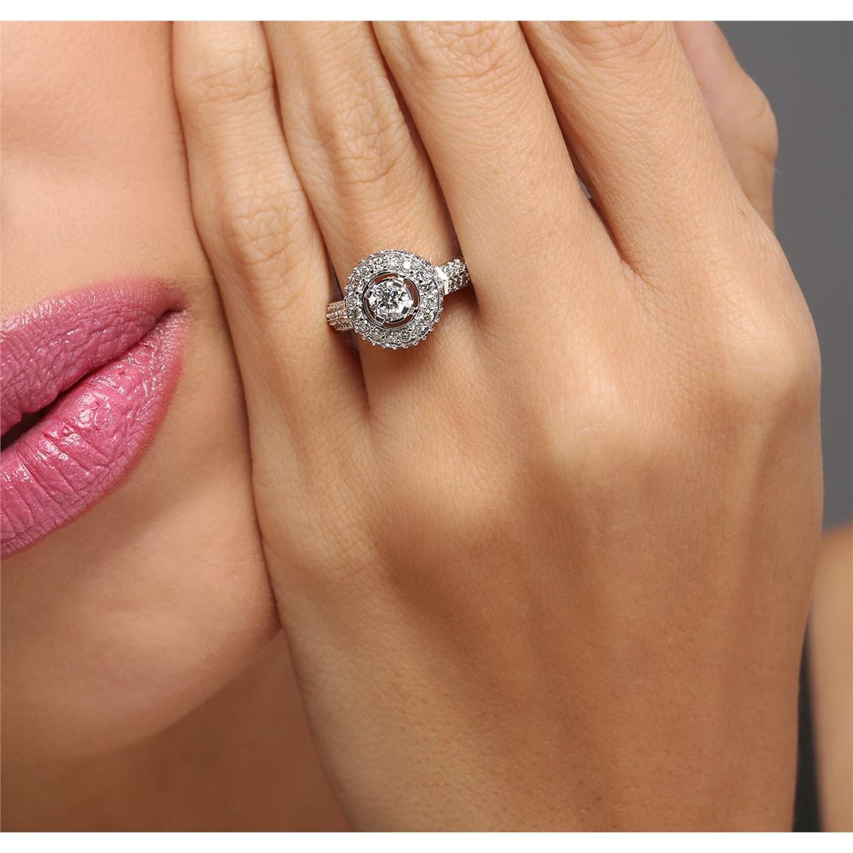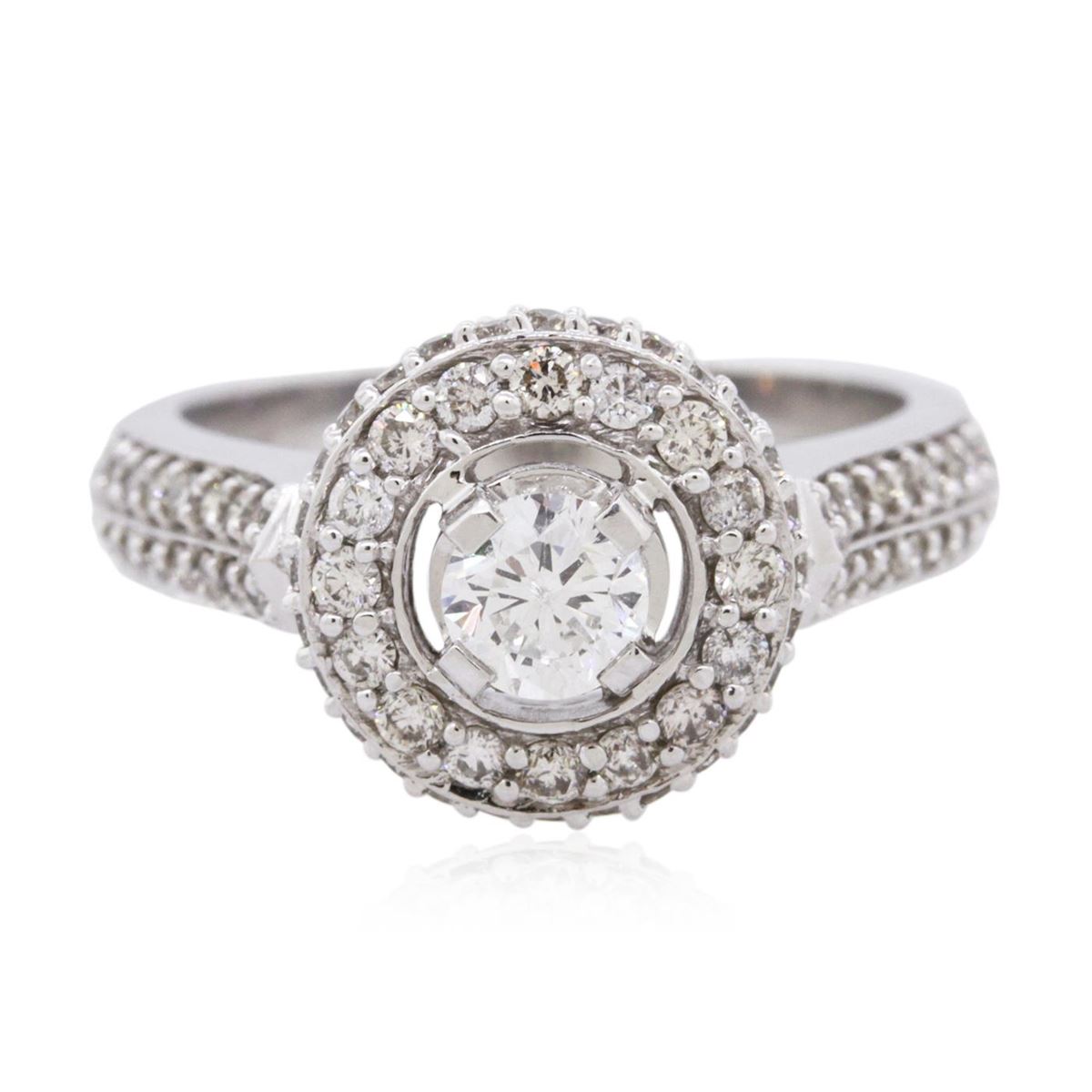 One electronically tested 14KT white gold ladies combination cast & assembled diamond engagement ring with a bright polish finish. Identified with markings of "14K". Condition is new. Containing: One prong set round brilliant cut diamond, measuring 4.50 - 4.50 x 2.70mm (depth est.) approximate weight of 0.33ct. Clarity: SI-2. Color: J, Cut is Good. Ninety-Two prong set round brilliant cut diamonds, measuring 1.00 - 1.00 x 0.60mm (depth est.) approximate total weight of 92 Stones = 0.33ct. Clarity: SI-2 to I-1. Color: J - K, Cut is Good. All diamonds are graded in the mounting, unless otherwise stated. Total Weight of Diamonds 0.67ct. Total Weight of Engagement Ring 5.50 grams. GGL Appraised at $4,805.00.