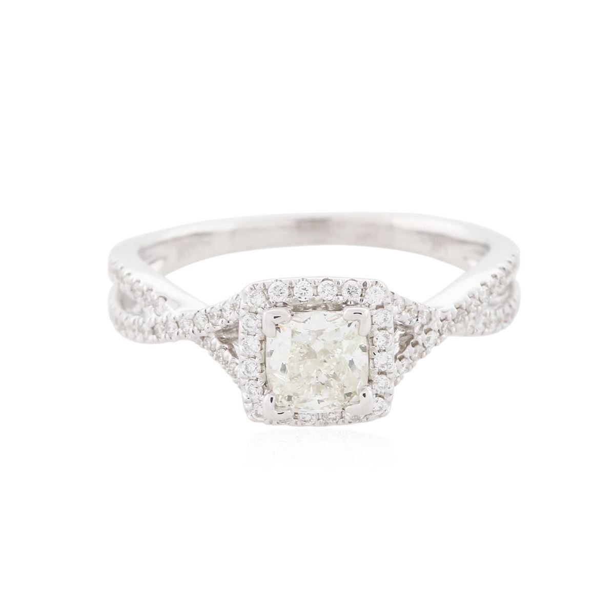 One ring featuring: 14KT white gold weighing 3.00 grams containing one prong set cushion cut center diamond with a total weight of 0.46ct and prong set round diamonds with a total weight of 0.21ct.