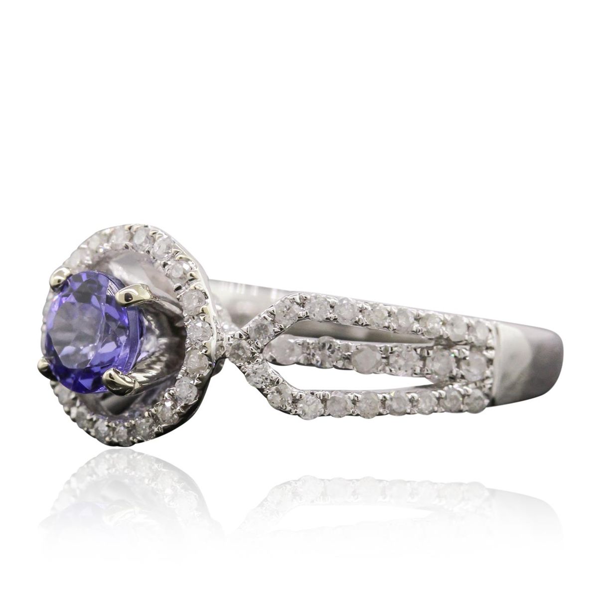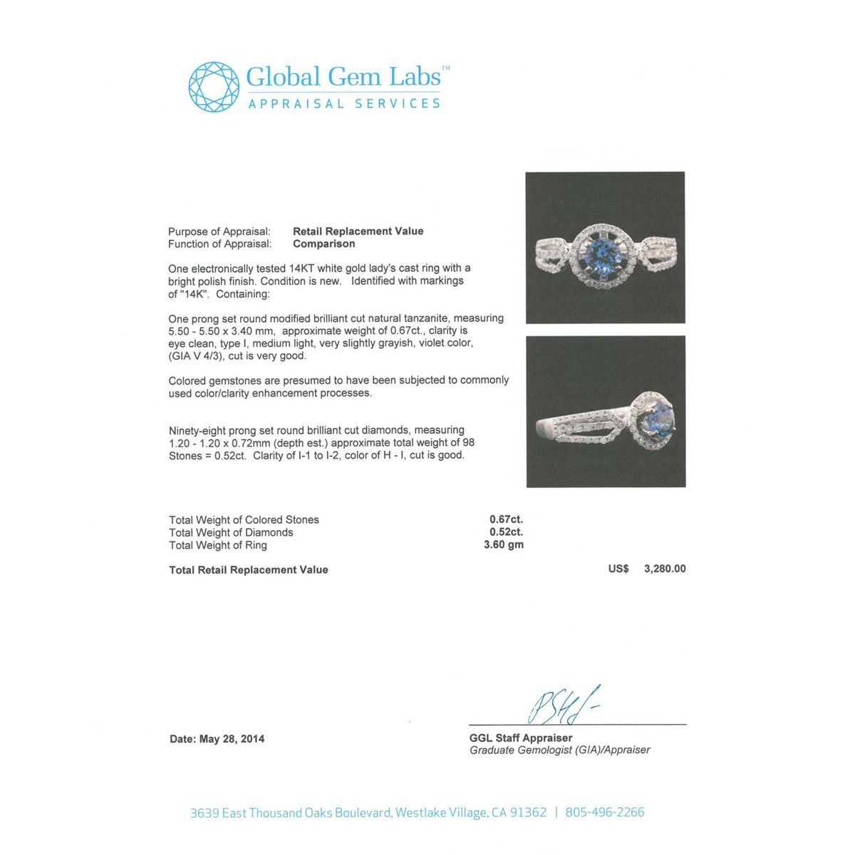 One electronically tested 14KT white gold Ladies cast ring with a bright polish finish. Condition is new. Identified with markings of "14K". Containing: One prong set round modified brilliant cut natural tanzanite, measuring 5.50 - 5.50 x 3.40 mm, approximate weight of 0.67ct., clarity is eye clean, type I, medium light, very slightly grayish, violet color, (GIA V 4/3), cut is very good. Colored gemstones are presumed to have been subjected to commonly used color/clarity enhancement processes. Ninety-Eight prong set round brilliant cut diamonds, measuring 1.20 - 1.20 x 0.72mm (depth est.) approximate. Total Weight of 98 Stones = 0.52ct. Clarity: I-1 to I-2. Color: H - I, Cut is Good. Total Weight of Colored Stones 0.67ct. Total Weight of Diamonds 0.52ct. Total Weight of Ring 3.60 grams. GGL Appraised at $3,280.00.