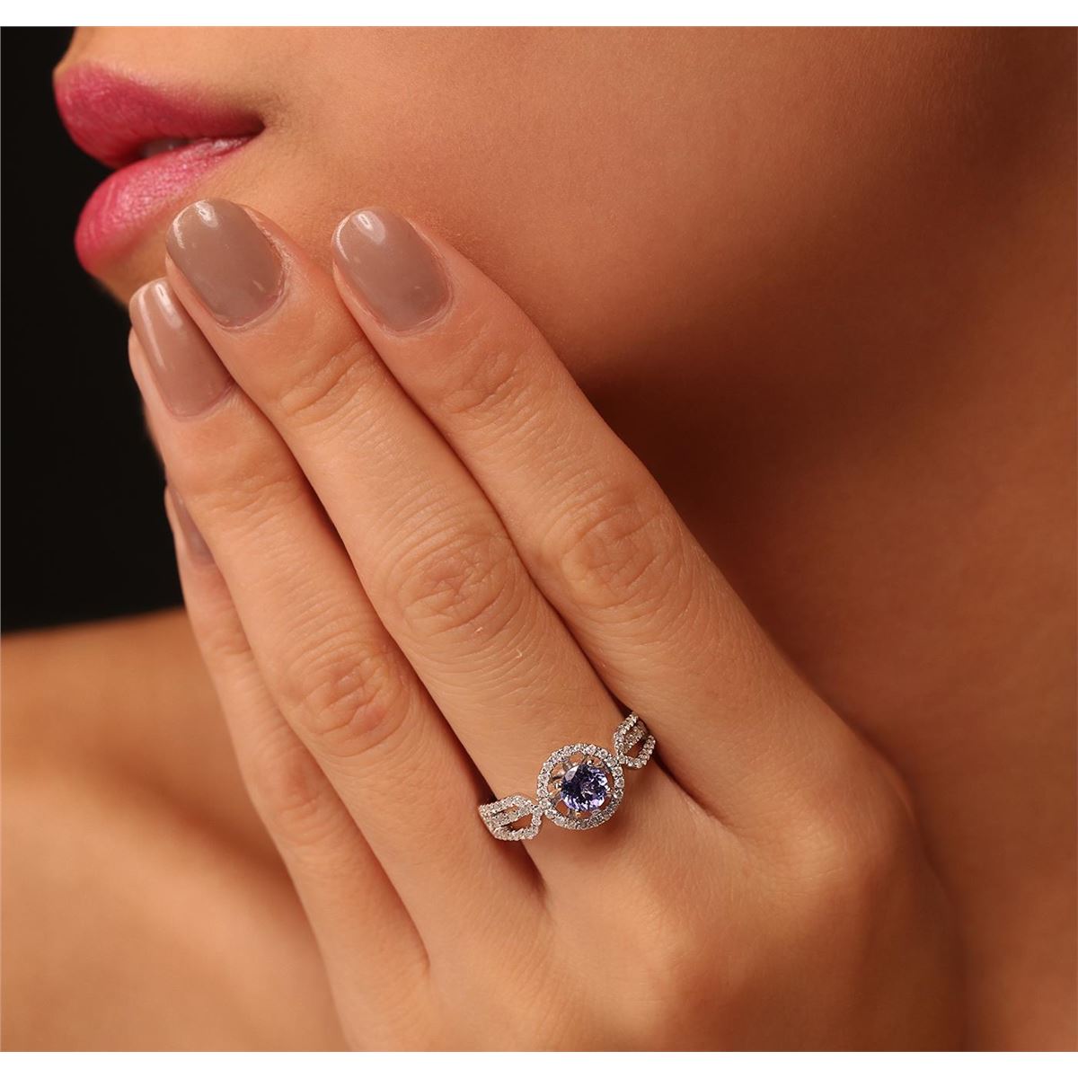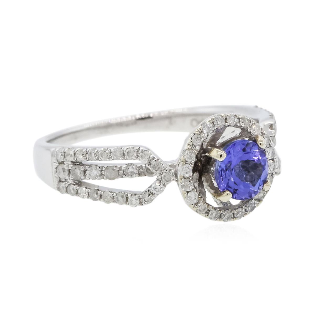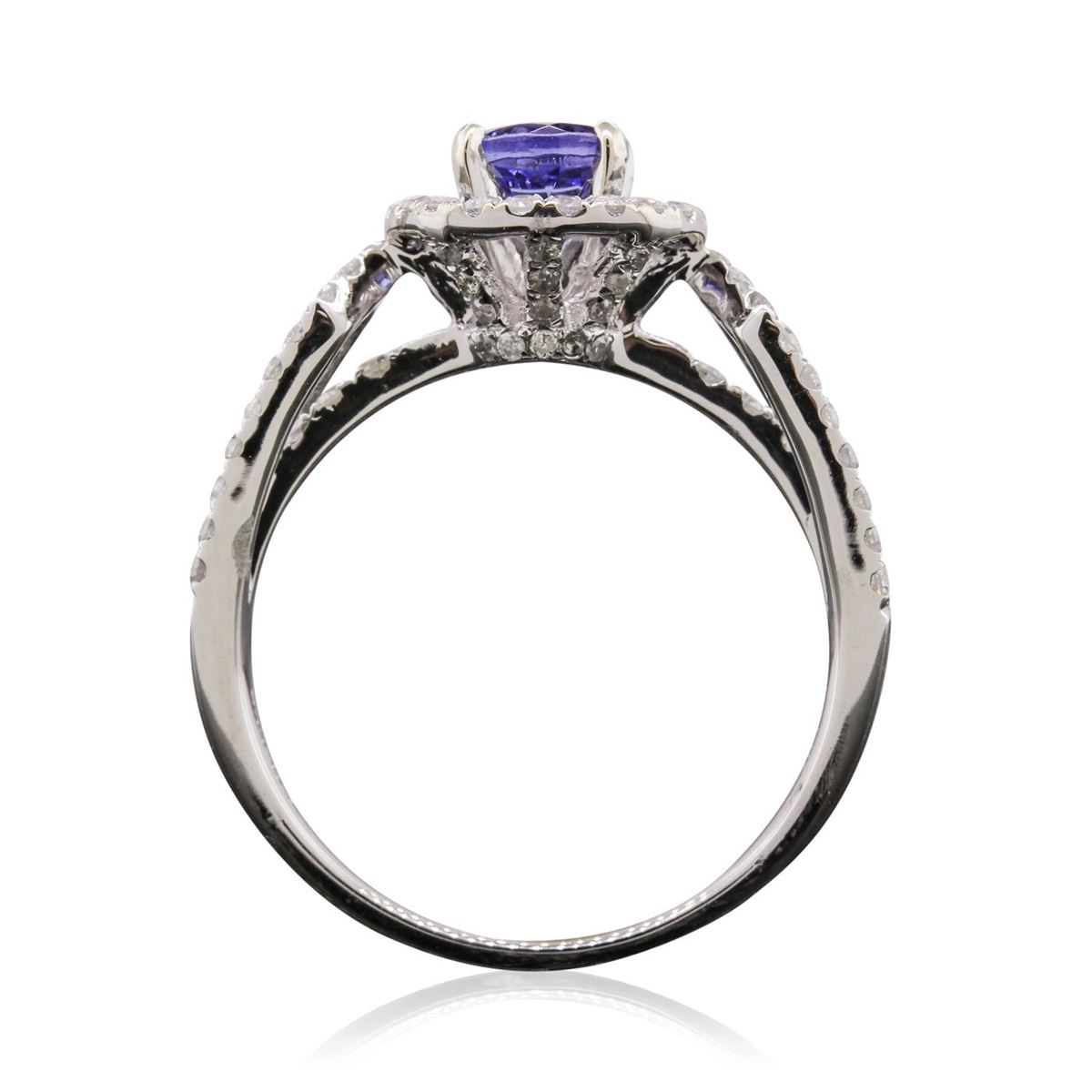 One electronically tested 14KT white gold Ladies cast ring with a bright polish finish. Condition is new. Identified with markings of "14K". Containing: One prong set round modified brilliant cut natural tanzanite, measuring 5.50 - 5.50 x 3.40 mm, approximate weight of 0.67ct., clarity is eye clean, type I, medium light, very slightly grayish, violet color, (GIA V 4/3), cut is very good. Colored gemstones are presumed to have been subjected to commonly used color/clarity enhancement processes. Ninety-Eight prong set round brilliant cut diamonds, measuring 1.20 - 1.20 x 0.72mm (depth est.) approximate. Total Weight of 98 Stones = 0.52ct. Clarity: I-1 to I-2. Color: H - I, Cut is Good. Total Weight of Colored Stones 0.67ct. Total Weight of Diamonds 0.52ct. Total Weight of Ring 3.60 grams. GGL Appraised at $3,280.00.