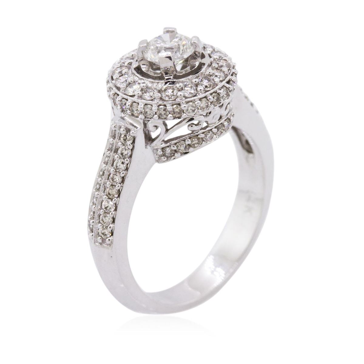 One electronically tested 14KT white gold ladies combination cast & assembled diamond engagement ring with a bright polish finish. Identified with markings of "14K". Condition is new. Containing: One prong set round brilliant cut diamond, measuring 4.50 - 4.50 x 2.70mm (depth est.) approximate weight of 0.33ct. Clarity: SI-2. Color: J, Cut is Good. Ninety-Two prong set round brilliant cut diamonds, measuring 1.00 - 1.00 x 0.60mm (depth est.) approximate total weight of 92 Stones = 0.33ct. Clarity: SI-2 to I-1. Color: J - K, Cut is Good. All diamonds are graded in the mounting, unless otherwise stated. Total Weight of Diamonds 0.67ct. Total Weight of Engagement Ring 5.50 grams. GGL Appraised at $4,805.00.