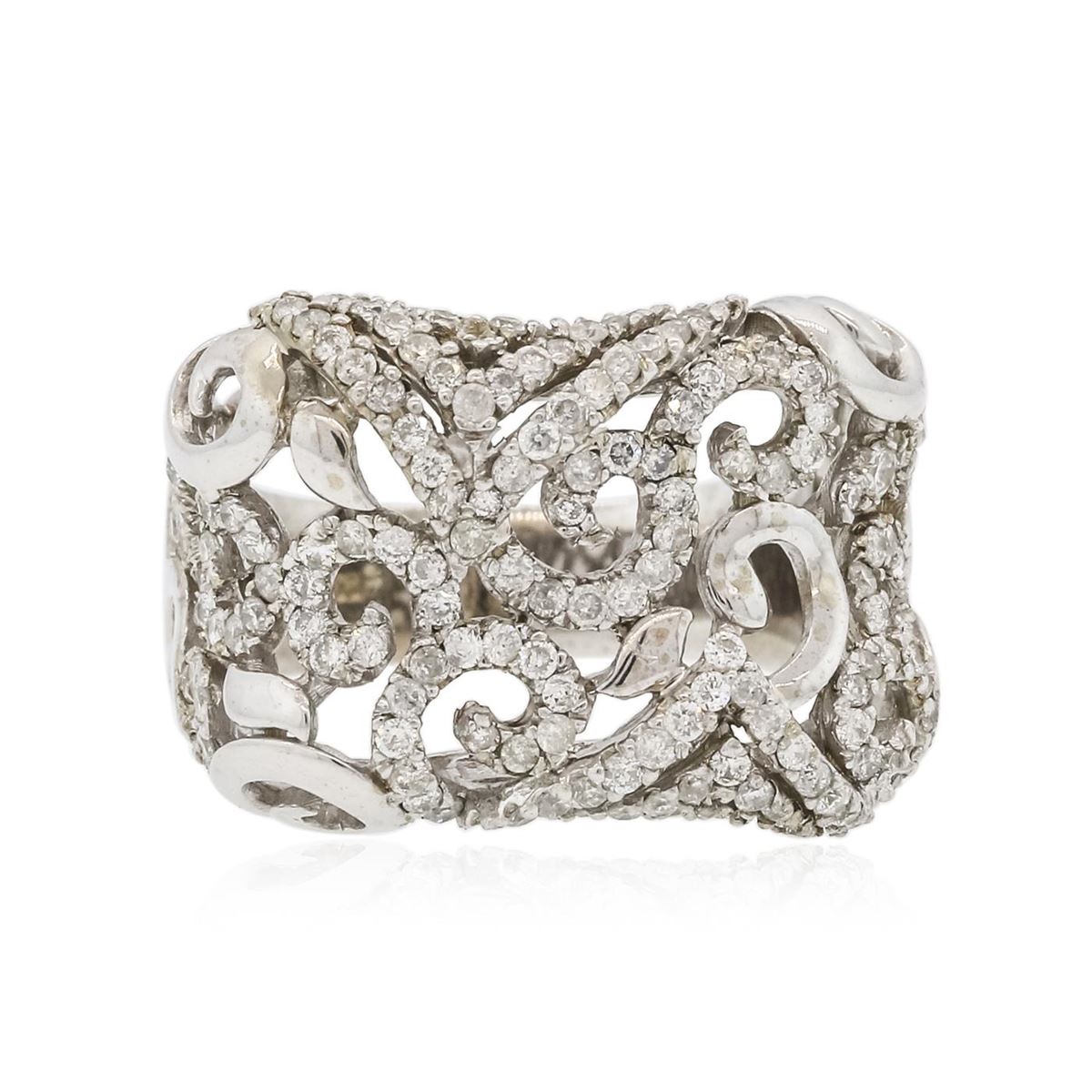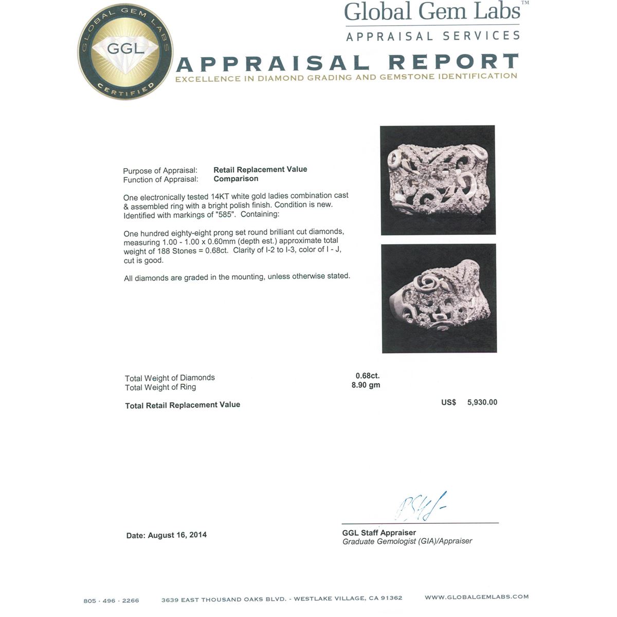 One electronically tested 14KT white gold ladies combination cast & assembled ring with a bright polish finish. Condition is new. Identified with markings of "585". Containing: One Hundred Eighty-Eight prong set round brilliant cut diamonds, measuring 1.00 - 1.00 x 0.60mm (depth est.) approximate. Total Weight of 188 Stones = 0.68ct. Clarity: I-2 to I-3. Color: I - J, Cut is Good. All diamonds are graded in the mounting, unless otherwise stated. Total Weight of Diamonds 0.68ct. Total Weight of Ring 8.90 grams. GGL Appraised at $5,930.00.