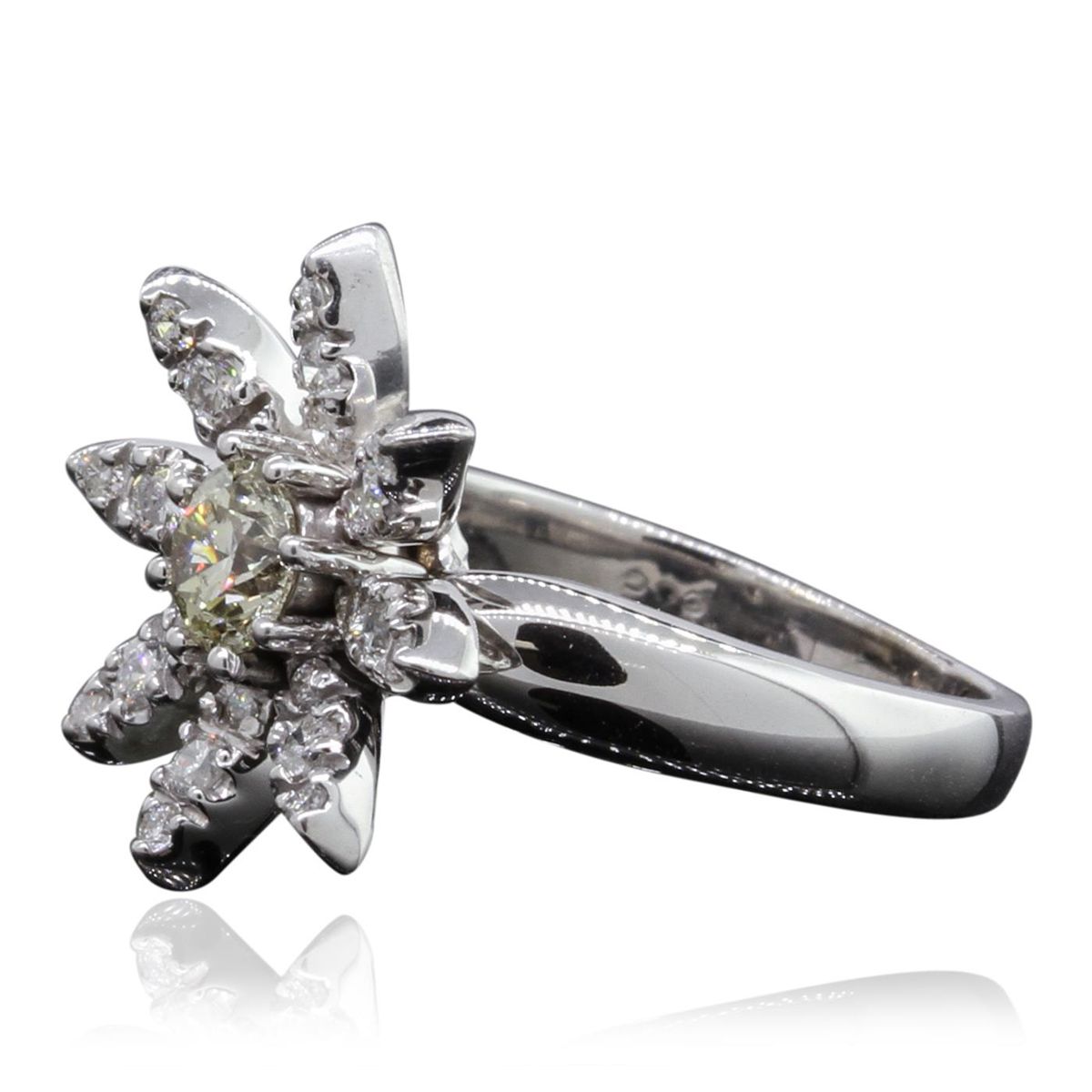 One electronically tested 14KT white gold Ladies combination cast & assembled engagement ring with a bright polish finish. Identified with markings of "585". Condition is new. Containing: One prong set round brilliant cut diamond, measuring 4.50 - 4.40 x 2.67mm (depth est.) approximate weight of 0.32ct. Clarity of SI-1, Cut is Very Good. Twenty-Four bead set round brilliant cut diamonds, measuring 2.00 - 1.20 x 0.96mm (depth est.) approximate total weight of 24 Stones = 0.36ct. Clarity of SI-1 to SI-2, Color of H - I, Cut is Good. Total Weight of Diamonds 0.68ct. Total Weight of Ring 5.50gm. GGL Appraised at $4,385.00.