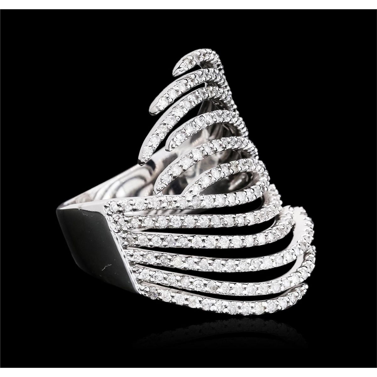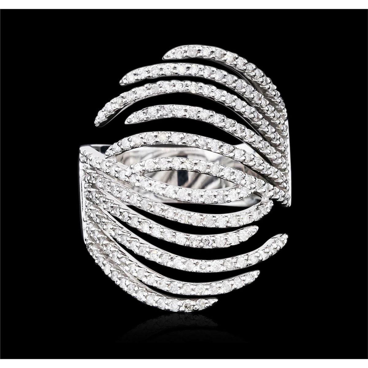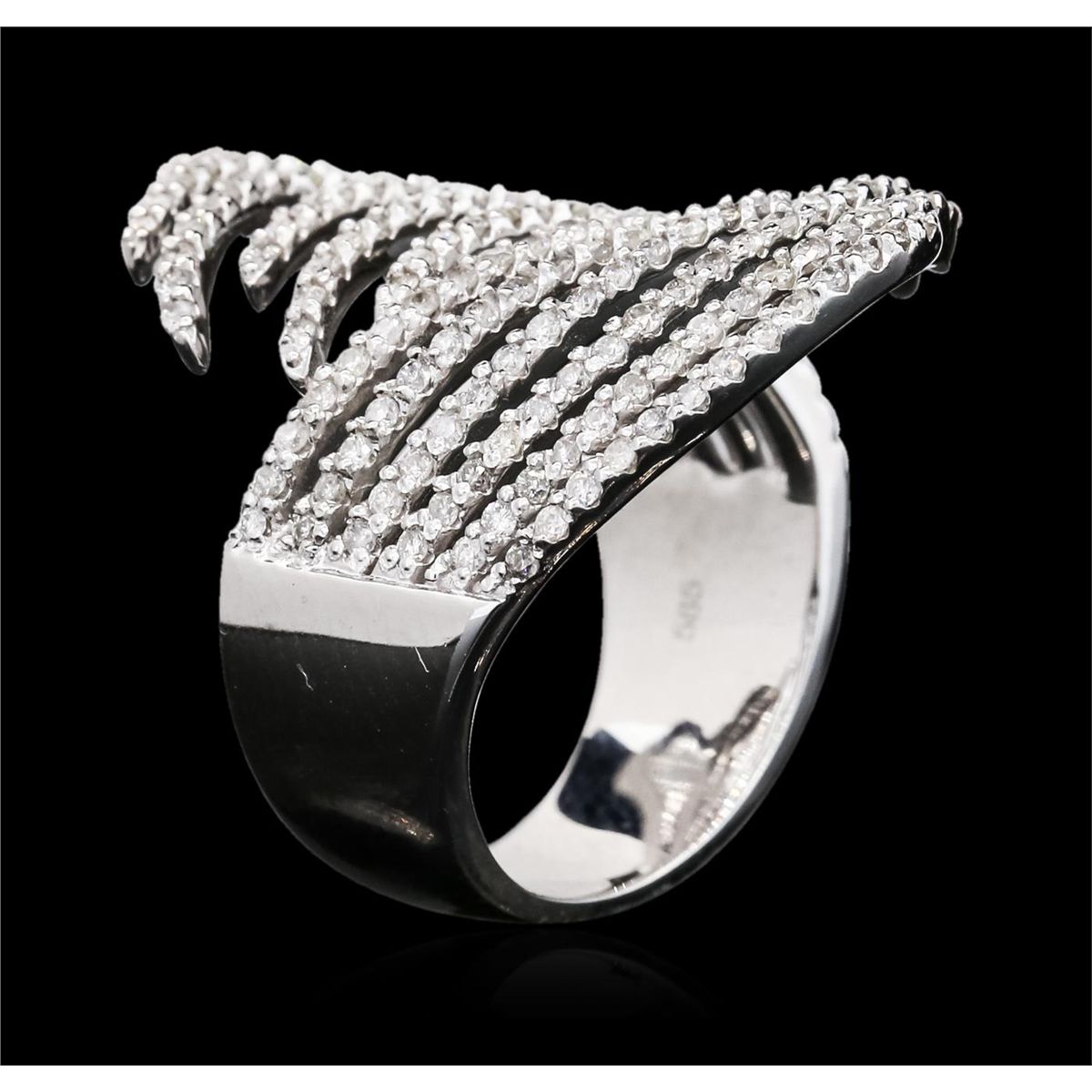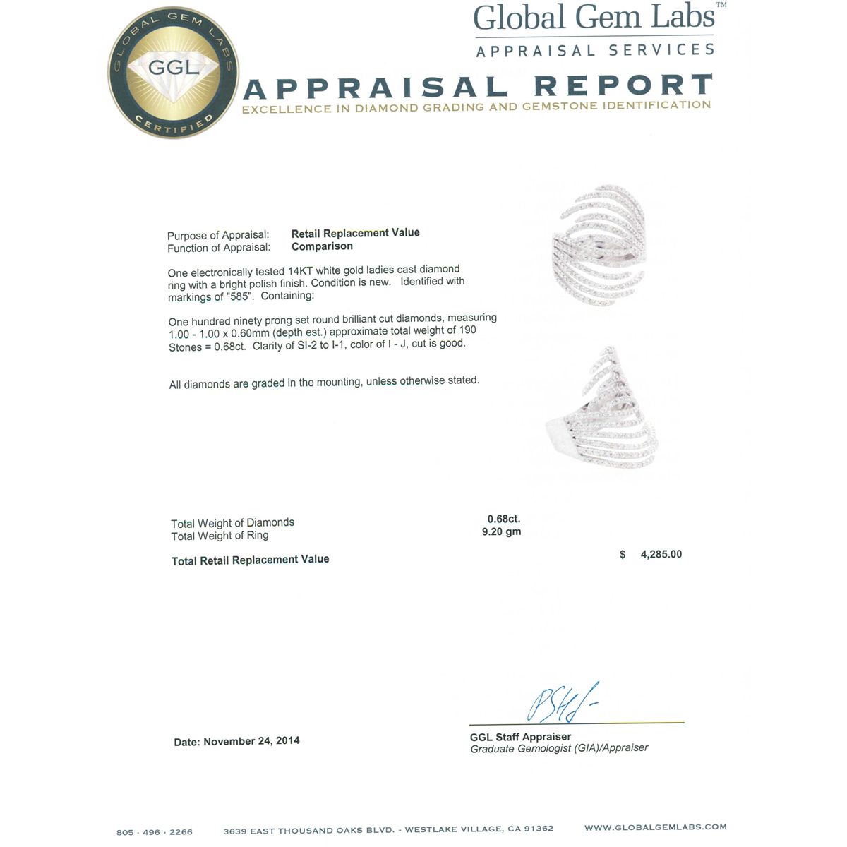 One electronically tested 14KT white gold ladies cast diamond ring with a bright polish finish. Identified with markings of "585". Condition is new. Containing: One Hundred Ninety prong set round brilliant cut diamonds, measuring 1.00 - 1.00 x 0.60mm (depth est.) approximate total weight of 190 Stones = 0.68ct. Clarity: SI-2 to I-1. Color: I - J, Cut is Good. All diamonds are graded in the mounting, unless otherwise stated. Total Weight of Diamonds 0.68ct. Total Weight of Ring 9.20 grams. GGL Appraised at $4,285.00.
