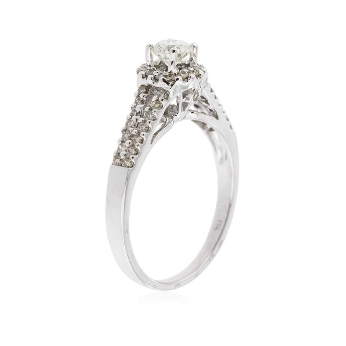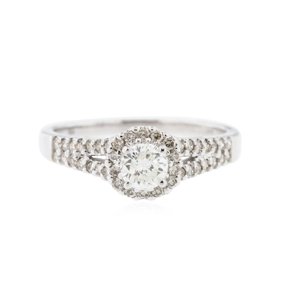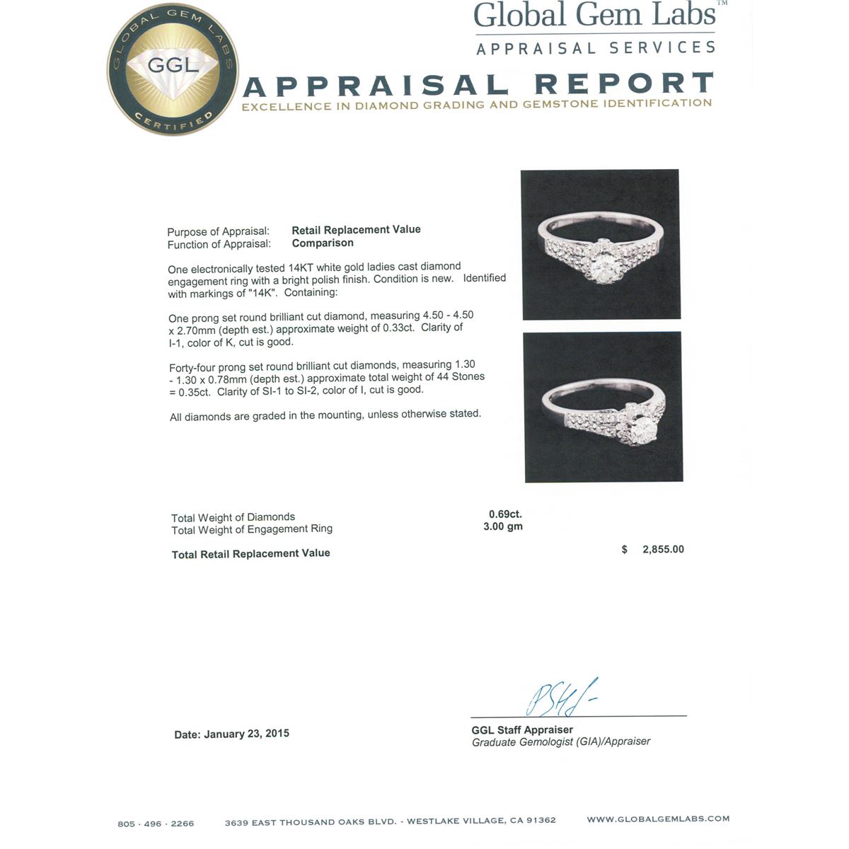One electronically tested 14KT white gold ladies cast diamond engagement ring with a bright polish finish. Identified with markings of "14K". Condition is new. Containing: One prong set round brilliant cut diamond, measuring 4.50 - 4.50 x 2.70mm (depth est.) approximate weight of 0.33ct. Clarity: I-1. Color: K, Cut is Good. Forty-Four prong set round brilliant cut diamonds, measuring 1.30 - 1.30 x 0.78mm (depth est.) approximate total weight of 44 Stones = 0.35ct. Clarity: SI-1 to SI-2. Color: I, Cut is Good. All diamonds are graded in the mounting, unless otherwise stated. Total Weight of Diamonds 0.69ct. Total Weight of Engagement Ring 3.00 grams. GGL Appraised at $2,855.00.