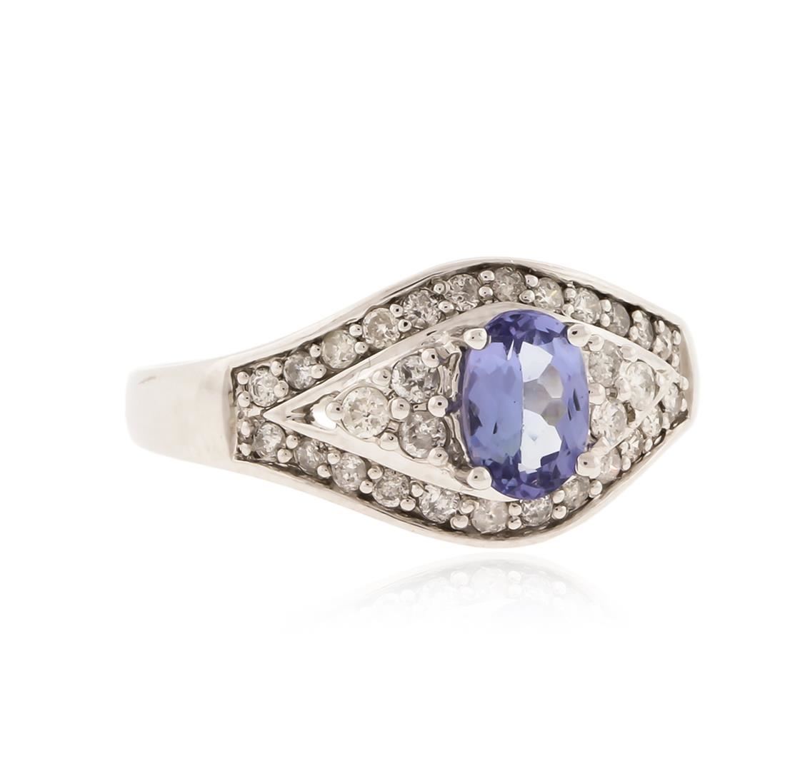 One electronically tested 14KT white gold ladies cast tanzanite and diamond ring with a bright polish finish. The featured tanzanite is supported by a diamond trio on either side and set within mirroring diamond ribbons, completed by a two and one-half millimeter wide band. Identified with markings of "14K". Condition is new, good workmanship. Containing: One prong set oval mixed cut natural tanzanite, measuring 6.80 x 4.80 x 2.90mm, 6% bulge factor, approximate weight of 0.69ct., clarity is slightly included, type I, medium light, very slightly grayish, bluish violet color, (GIA bV 4/3), cut is good. Transmitting light with no distortion, transparent. Graded in the setting. Tanzanite is a very rare gemstone that is only found in the country of Tanzania. Originally discovered in 1967. Tiffany & Company, named the stone Tanzanite. It is found in the Usumburu Mountains that border the Umba Valley of northern Tanzania. Tanzanite occurs in gray, brown, violet, blue, reddish-purple, & green. The gem is interesting because of its exceptional pleochroism. Rotated in different directions a tanzanite will exhibit multiple changes of color. Tanzanite has a low tolerance to ultrasonic cleaning, and should not be cleaned using this method. Thirty prong set round brilliant cut diamonds, measuring 1.80 - 1.60 x 1.02mm (depth est.) approximate total weight of 30 Stones = 0.63ct. Graded in the setting. Clarity: I-1 to I-2. Color: H - J. Total Weight of Colored Stones 0.69ct. Total Weight of Diamonds 0.63ct. Total Weight of Ring 3.47 grams. AIG Appraised at $2,560.00.