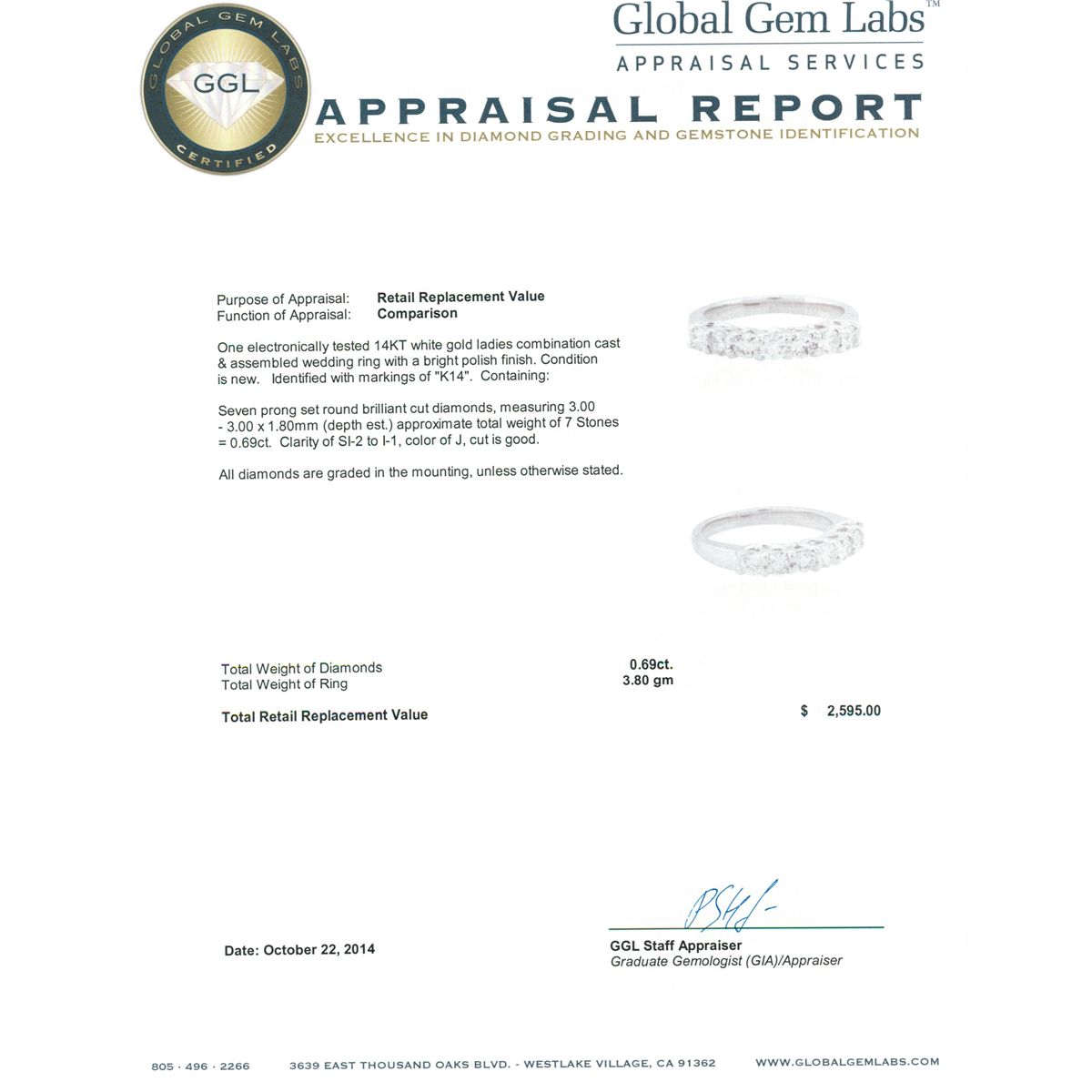 One electronically tested 14KT white gold ladies combination cast & assembled wedding ring with a bright polish finish. Identified with markings of "K14". Condition is new. Containing: Seven prong set round brilliant cut diamonds, measuring 3.00 - 3.00 x 1.80mm (depth est.) approximate total  weight of 7 Stones = 0.69ct. Clarity: SI-2 to I-1. Color: J, Cut is Good. All diamonds are graded in the mounting, unless otherwise stated. Total Weight of Diamonds 0.69ct. Total Weight of Ring 3.80 grams. GGL Appraised at $2,595.00.