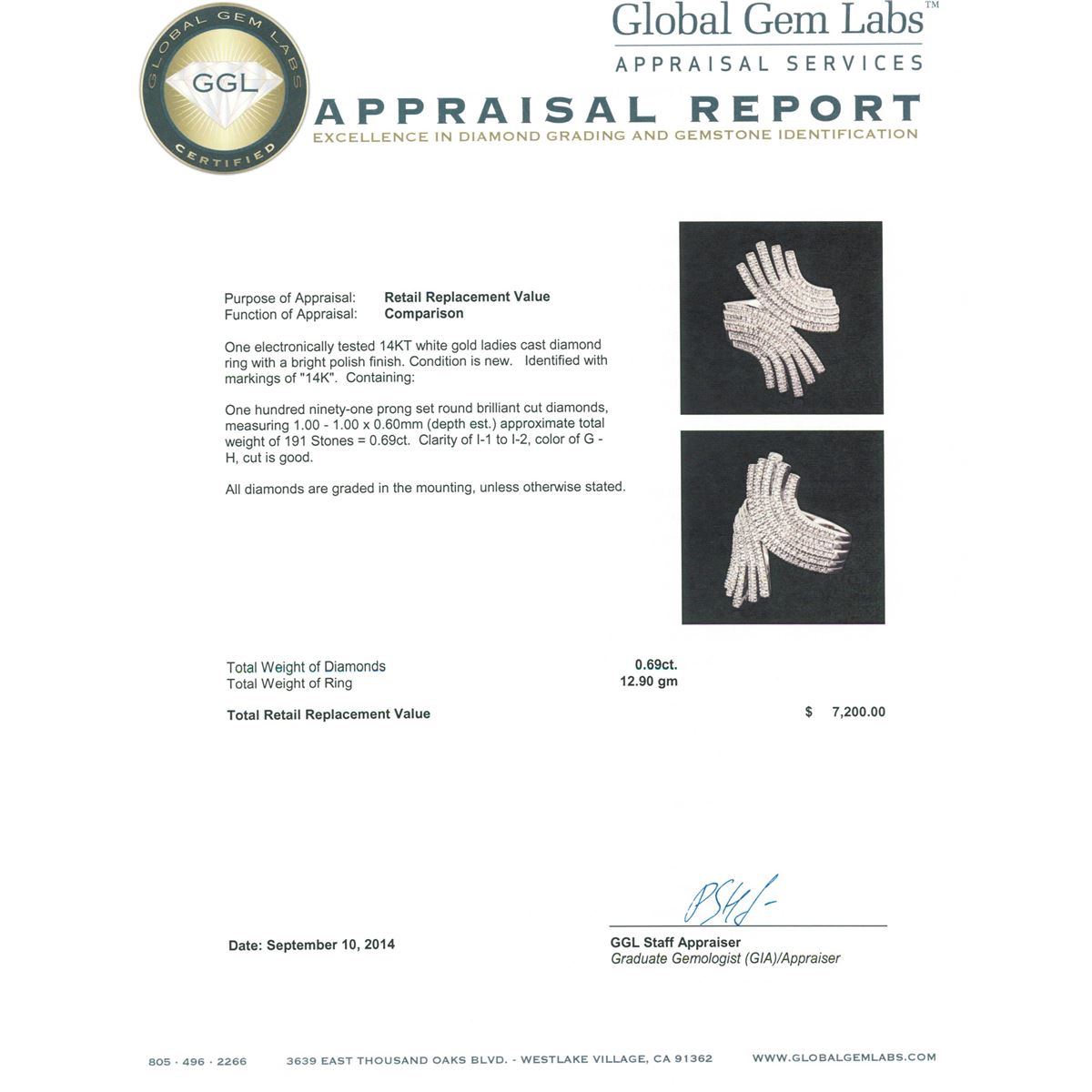 One electronically tested 14KT white gold ladies cast diamond ring with a bright polish finish. Identified with markings of "14K". Condition is new. Containing: One Hundred Ninety-One prong set round brilliant cut diamonds, measuring 1.00 - 1.00 x 0.60mm (depth est.) approximate total weight of 191 Stones = 0.69ct. Clarity: I-1 to I-2. Color: G - H, Cut is Good. All diamonds are graded in the mounting, unless otherwise stated. Total Weight of Diamonds 0.69ct. Total Weight of Ring 12.90 grams. GGL Appraised at $7,200.00.