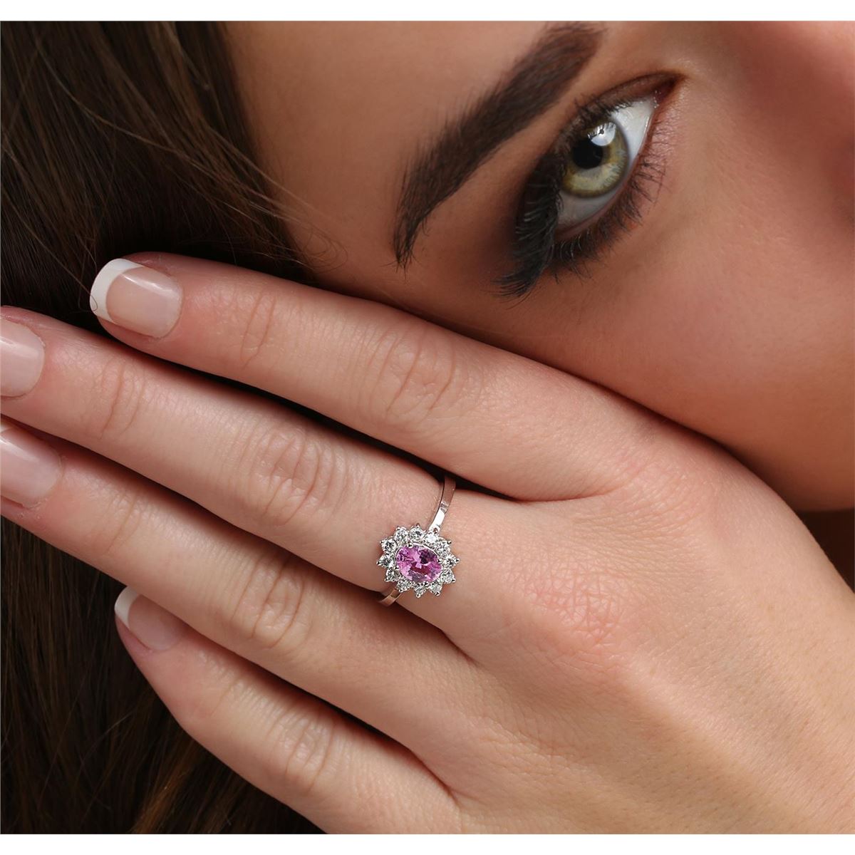 One electronically tested 14KT white gold ladies cast pink sapphire and diamond ring with a bright polish finish. The featured pink sapphire is set within a diamond bezel, completed by a two millimeter wide band. Identified with markings of "14K". Condition is new, good workmanship. Containing: One prong set oval mixed cut natural pink sapphire, measuring 6.20 x 4.30 x 2.55mm, 6% bulge factor, approximate weight of 0.70ct., clarity is slightly included, medium dark, moderately strong, pink color, (GIA Pk 6/4), cut is good. Transmitting light with a minimum of distortion, transparent. Naturally occurring internal & external characteristics are present. Graded in the setting. Twelve prong set round brilliant cut diamonds, measuring 2.00 - 1.90 x 1.17mm (depth est.) approximate total weight of 12 Stones = 0.42ct. Graded in the setting. Clarity VS-2 to SI-1. Color G - I. Total Weight of Colored Stones 0.70 ct. Total Weight of Diamonds 0.42ct. Total Weight of Ring 3.44 grams. AIG Appraised at $2,530.00.