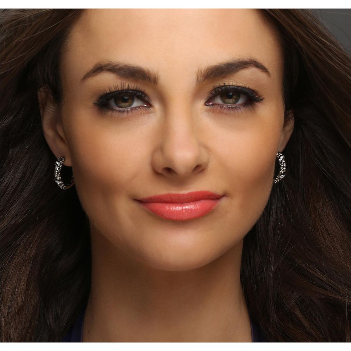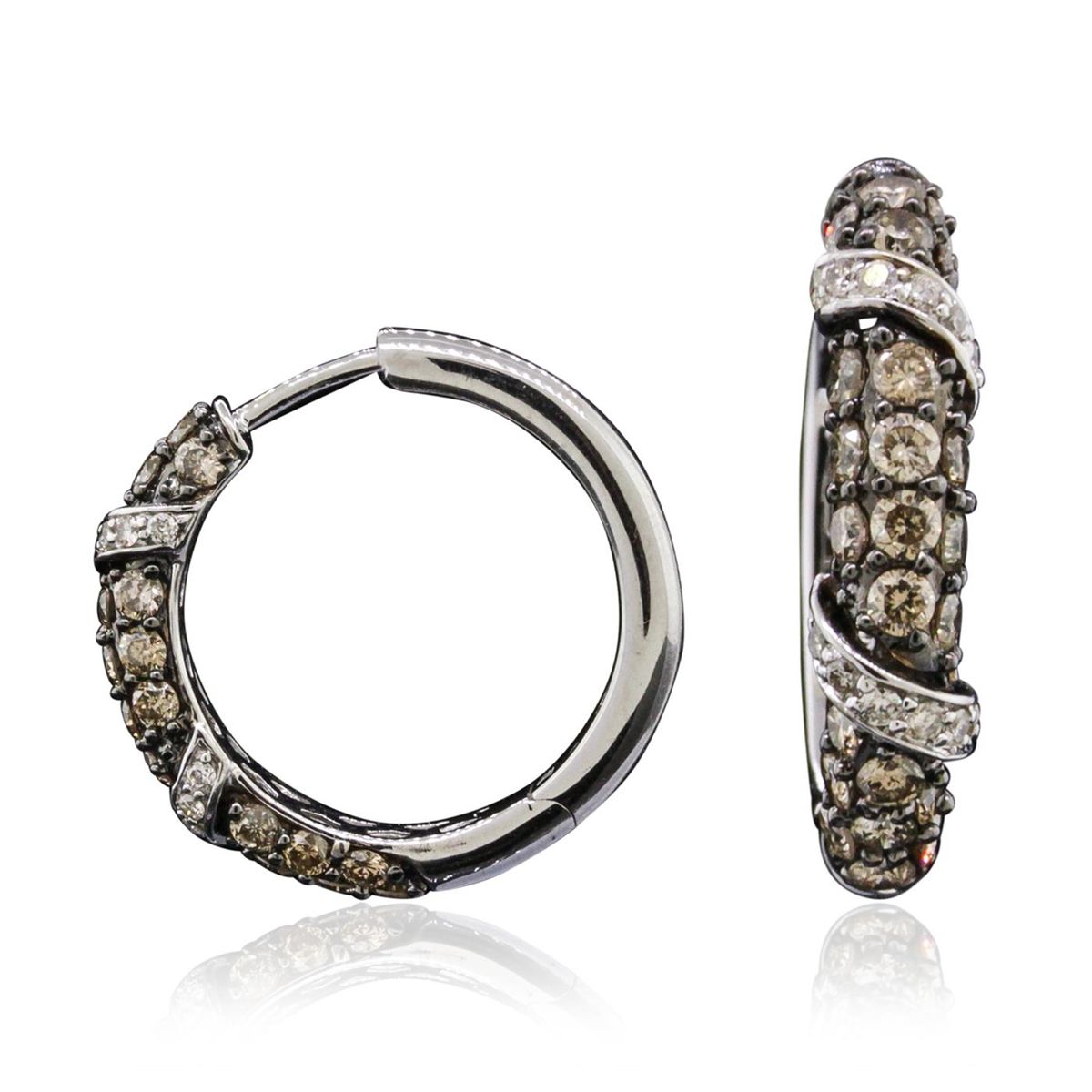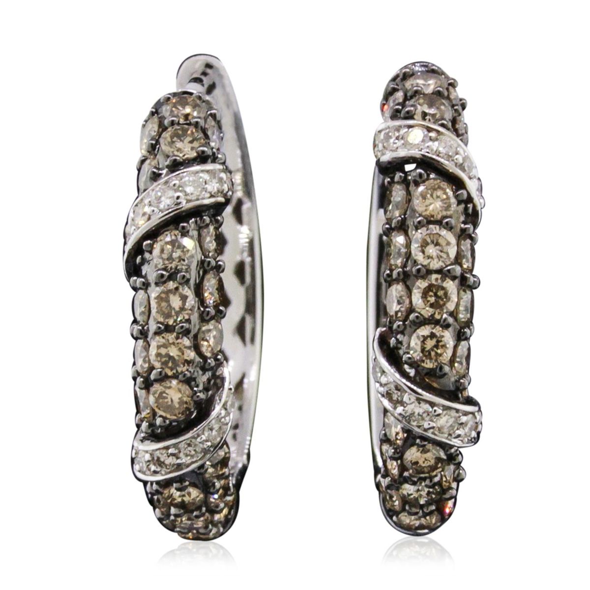 One pair electronically tested 14KT white gold ladies cast diamond hoop earrings with light friction backs with a bright polish finish. Identified with markings of "14K". Condition is new. Containing: Forty-Six prong set round brilliant cut diamonds, measuring 1.90 - 1.90 x 1.14mm (depth est.) approximate total weight of 46 Stones = 0.59ct. Clarity: I-1,color of Fancy Brown, cut is Good. Twenty-Four prong set round brilliant cut diamonds, measuring 1.10 - 1.10 x 0.66mm (depth est.) approximate total weight of 24 Stones = 0.12ct. . Clarity: I-1 to I-2. Color: I - J, Cut is Good. All diamonds are graded in the mounting, unless otherwise stated.. Total Weight of Diamonds 0.70ct.. Total Weight of Earrings 7.40 grams. GGL Appraised at $5,600.00.