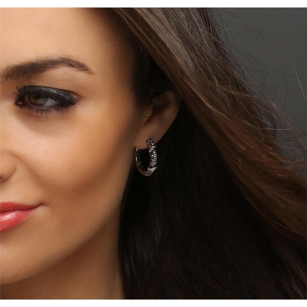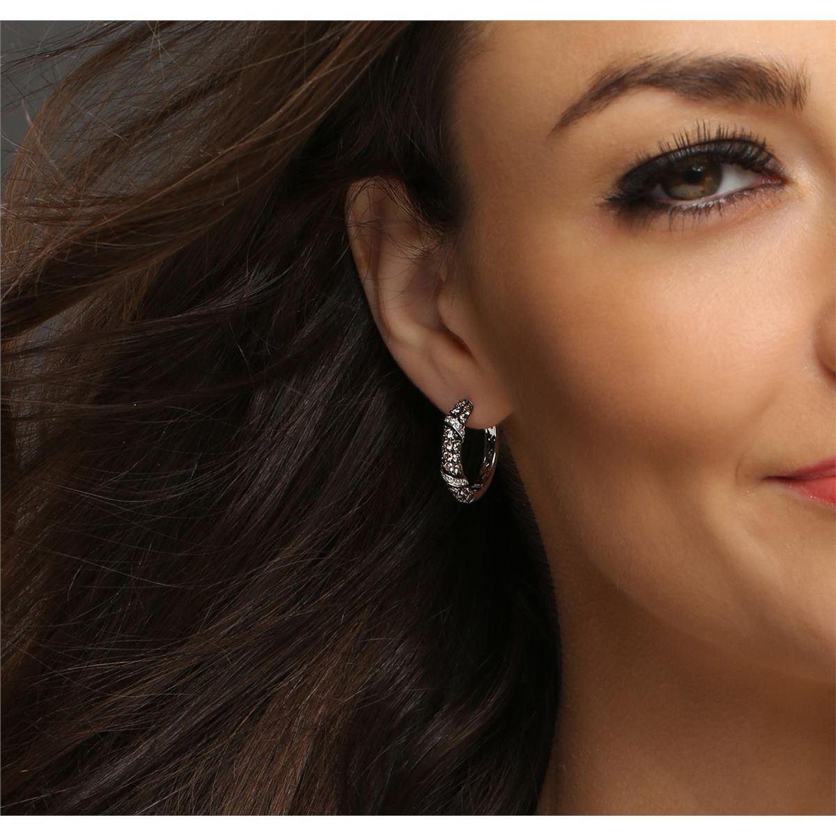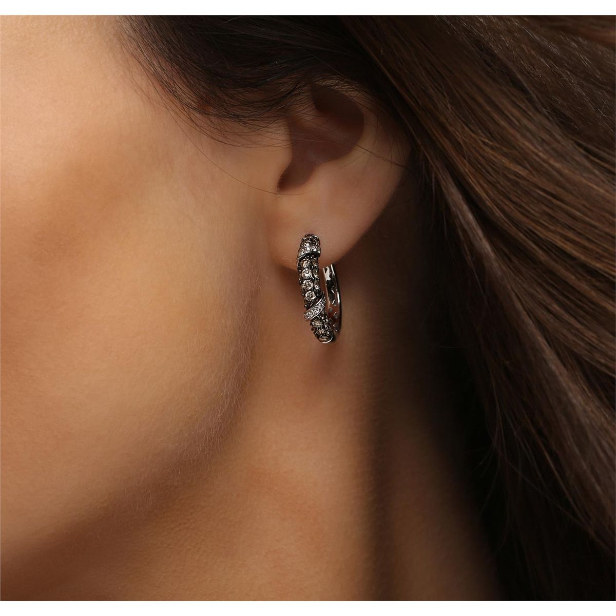 One pair electronically tested 14KT white gold ladies cast diamond hoop earrings with light friction backs with a bright polish finish. Identified with markings of "14K". Condition is new. Containing: Forty-Six prong set round brilliant cut diamonds, measuring 1.90 - 1.90 x 1.14mm (depth est.) approximate total weight of 46 Stones = 0.59ct. Clarity: I-1,color of Fancy Brown, cut is Good. Twenty-Four prong set round brilliant cut diamonds, measuring 1.10 - 1.10 x 0.66mm (depth est.) approximate total weight of 24 Stones = 0.12ct. . Clarity: I-1 to I-2. Color: I - J, Cut is Good. All diamonds are graded in the mounting, unless otherwise stated.. Total Weight of Diamonds 0.70ct.. Total Weight of Earrings 7.40 grams. GGL Appraised at $5,600.00.