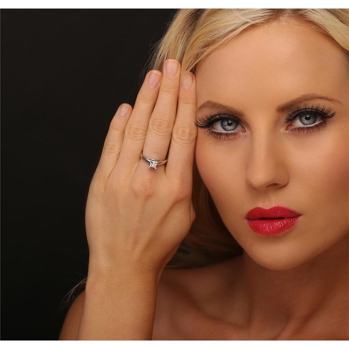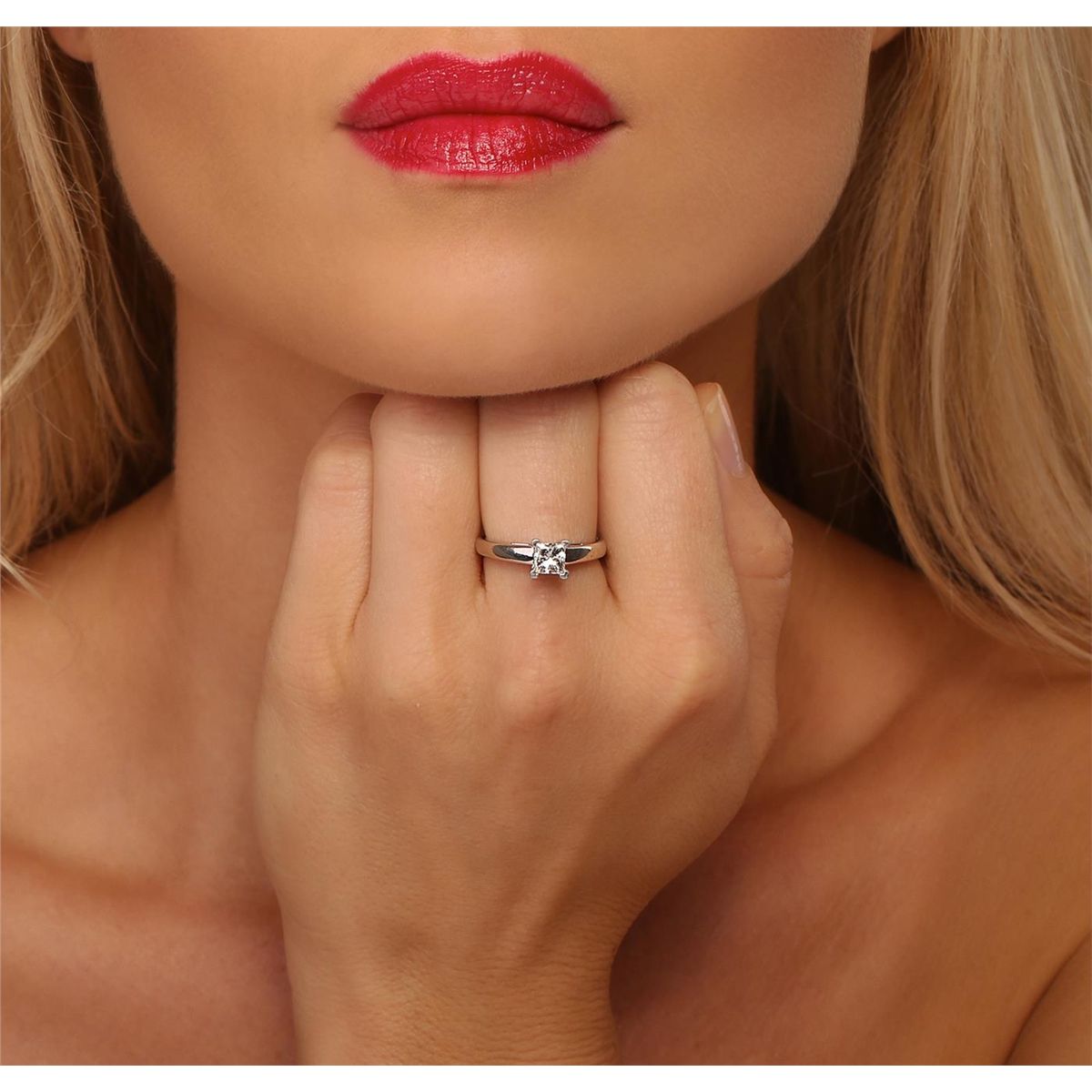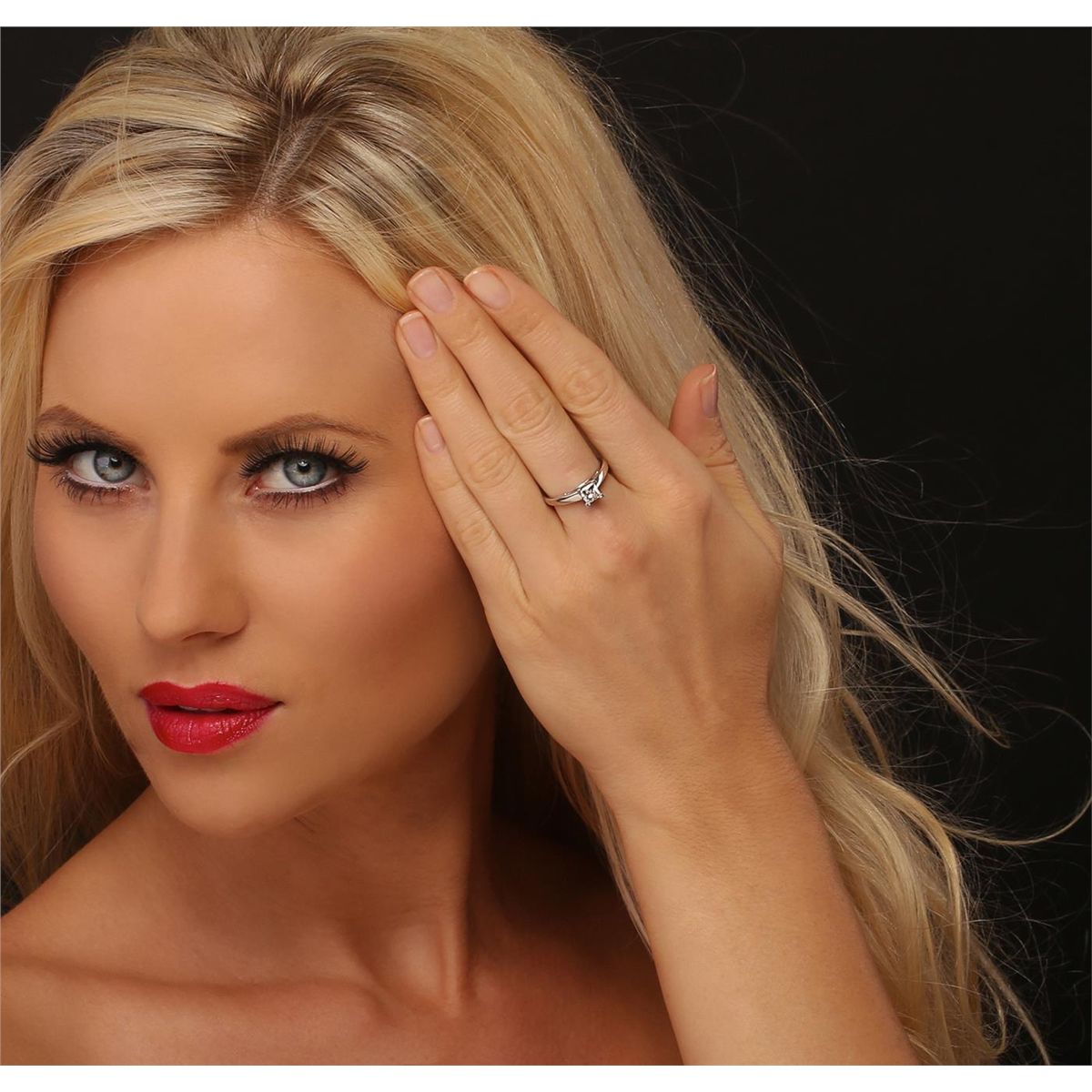 One stamped 14KT white gold Ladies cast engagement ring with a cathedral shank with a bright polish finish. Condition is good. Ring features one princess cut diamond in platinum v prong basket peg set on a cathedral white gold shank stamped 3 14K PLAT LSC-9.70 THE LEO with a hidden round brilliant cut diamond on the inside of the shank size 6.25. Containing: One v - prong set princess cut diamond, measuring 4.82 x 4.80 x 3.61mm (depth est.) exact weight 0.70ct. Clarity of SI-1, color of G, cut is very good. Total Weight of Diamonds 0.70ct. Total Weight of Engagement Ring 4.70 gm. GGL Appraised at $10,090.00.