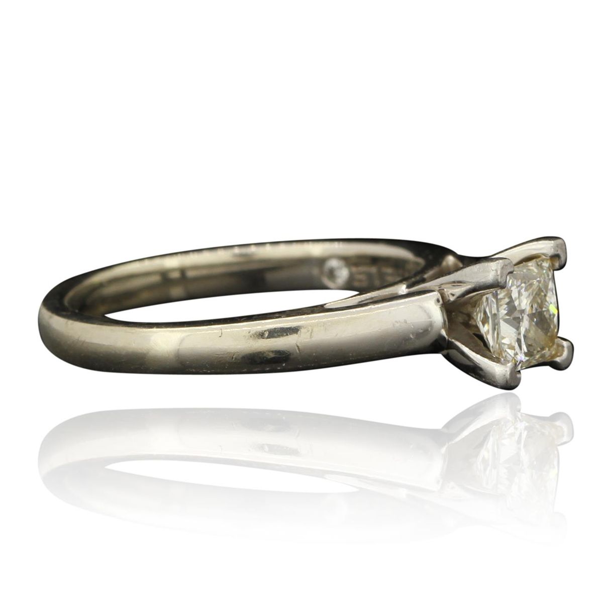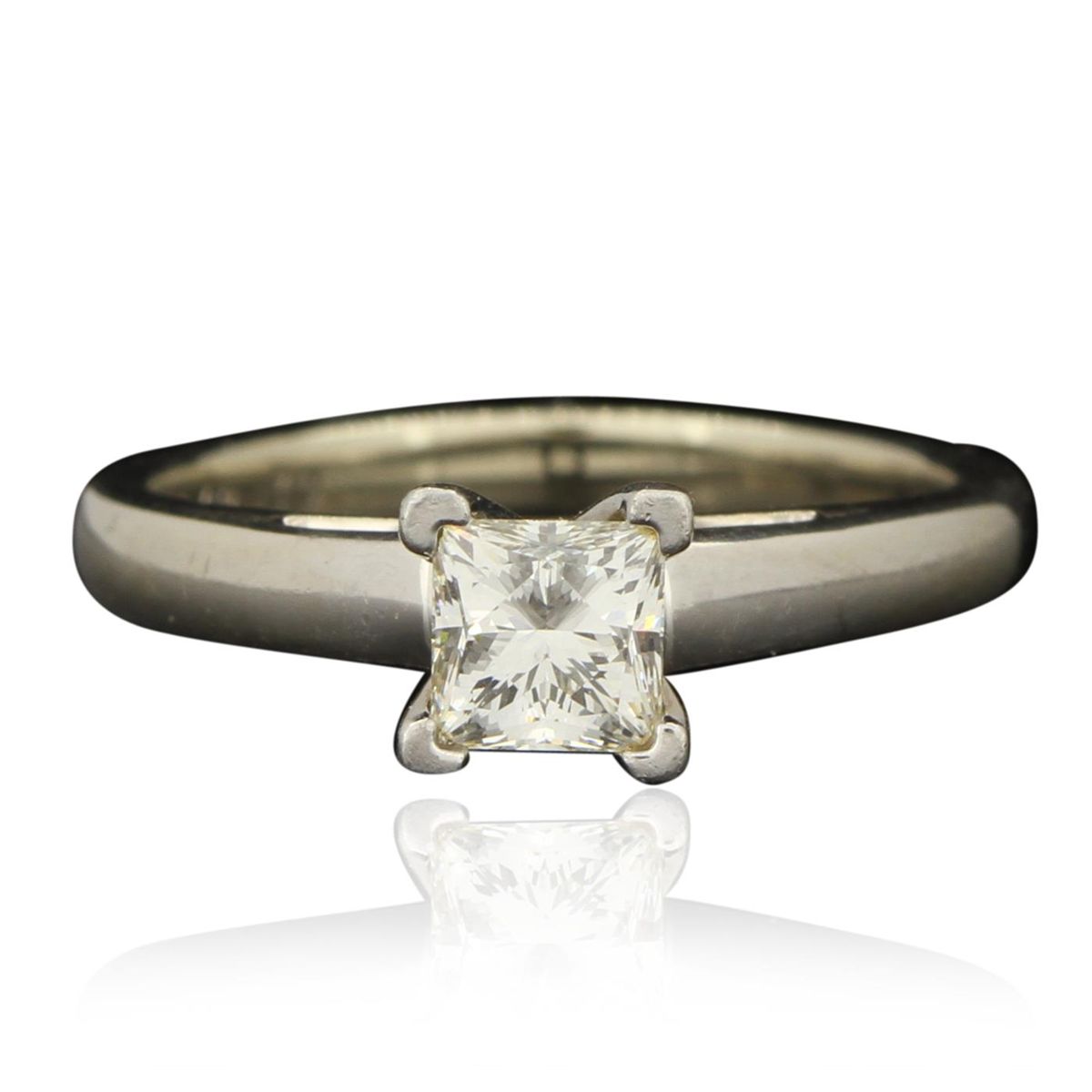 One stamped 14KT white gold Ladies cast engagement ring with a cathedral shank with a bright polish finish. Condition is good. Ring features one princess cut diamond in platinum v prong basket peg set on a cathedral white gold shank stamped 3 14K PLAT LSC-9.70 THE LEO with a hidden round brilliant cut diamond on the inside of the shank size 6.25. Containing: One v - prong set princess cut diamond, measuring 4.82 x 4.80 x 3.61mm (depth est.) exact weight 0.70ct. Clarity of SI-1, color of G, cut is very good. Total Weight of Diamonds 0.70ct. Total Weight of Engagement Ring 4.70 gm. GGL Appraised at $10,090.00.