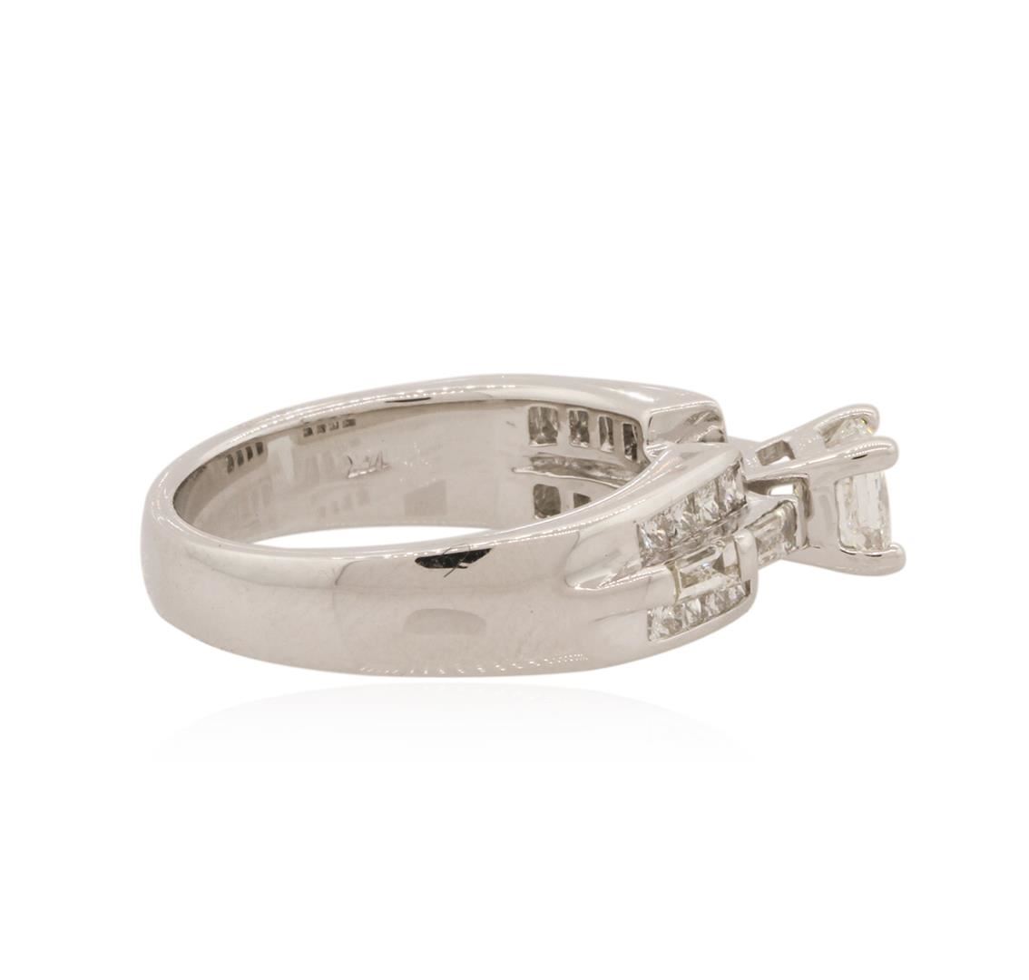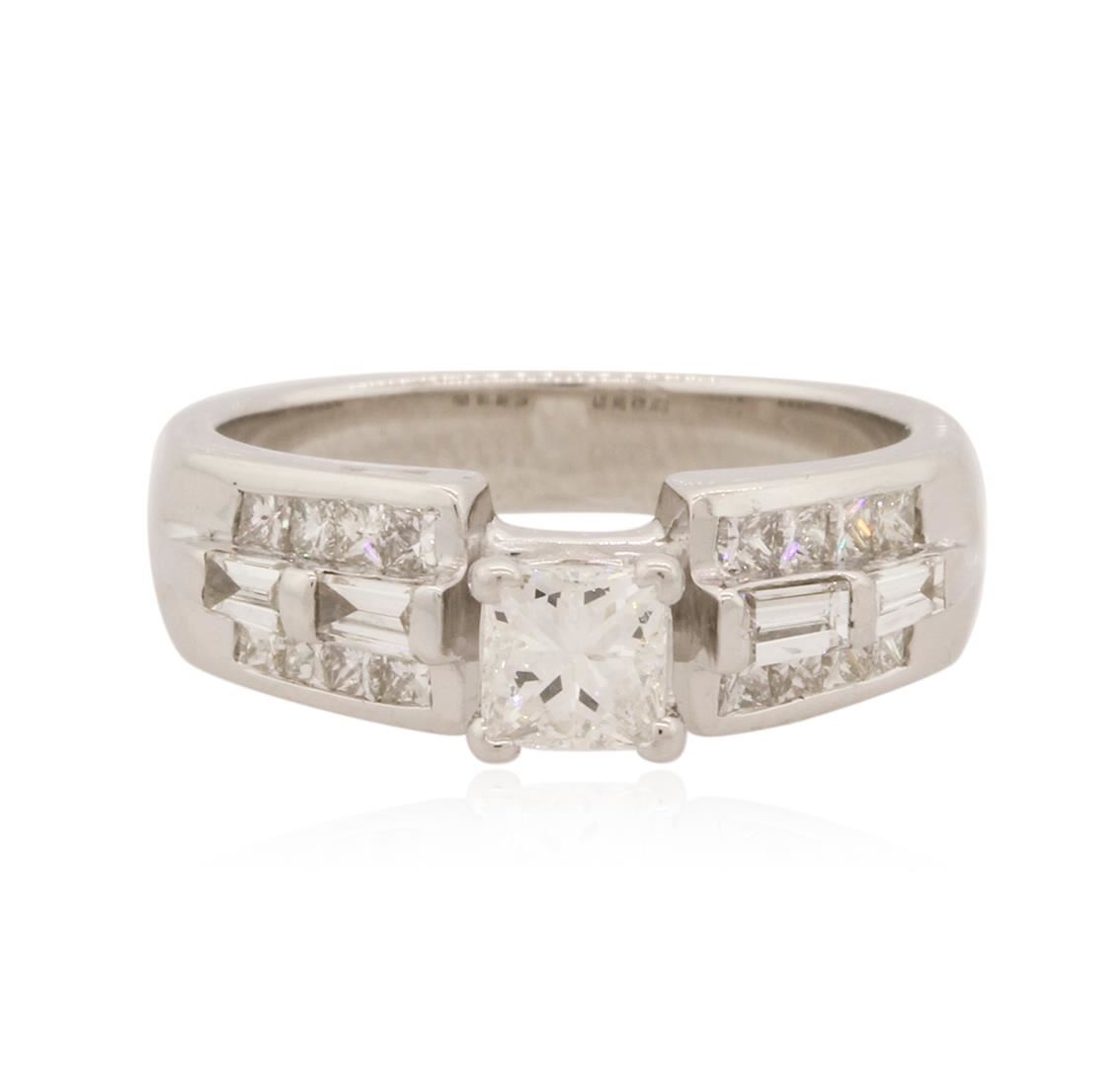 One electronically tested 14KT white gold ladies cast diamond engagement ring with a half round shank with a bright polish finish. Identified with markings of "14K". Condition is new. Containing: One prong set princess cut diamond, measuring 4.30 x 4.30 x 3.23mm (depth est.) approximate weight of 0.49ct. Clarity: VS-2. Color: H, Cut is Good. Sixteen channel set princess cut diamonds, measuring 0.50 x 1.50 x 1.13mm (depth est.) approximate total weight of 16 Stones = 0.11ct. Clarity: VS-2. Color: H - I, Cut is Good. Four prong set baguette cut diamonds, measuring 2.50 x 1.20 x 1.02mm (depth est.) approximate total weight of 4 Stones = 0.11ct. Clarity: VS-2 to SI-1. Color: H - I, Cut is Good. All diamonds are graded in the mounting, unless otherwise stated. Total Weight of Diamonds 0.71ct. Total Weight of Engagement Ring 6.10 grams. GGL Appraised at $4,020.00.