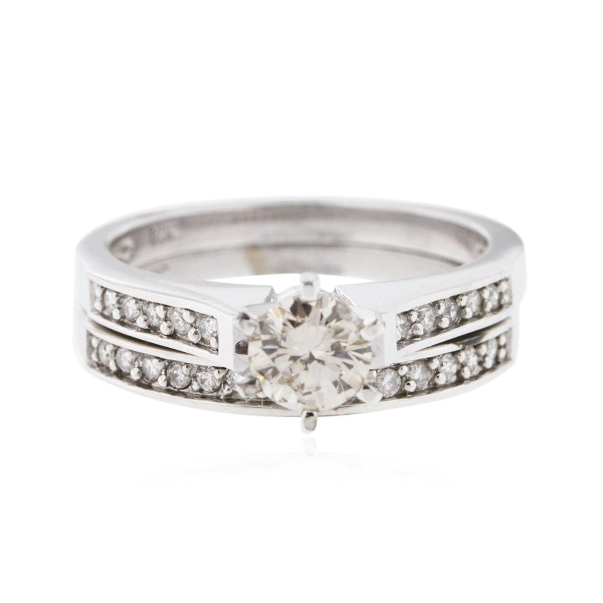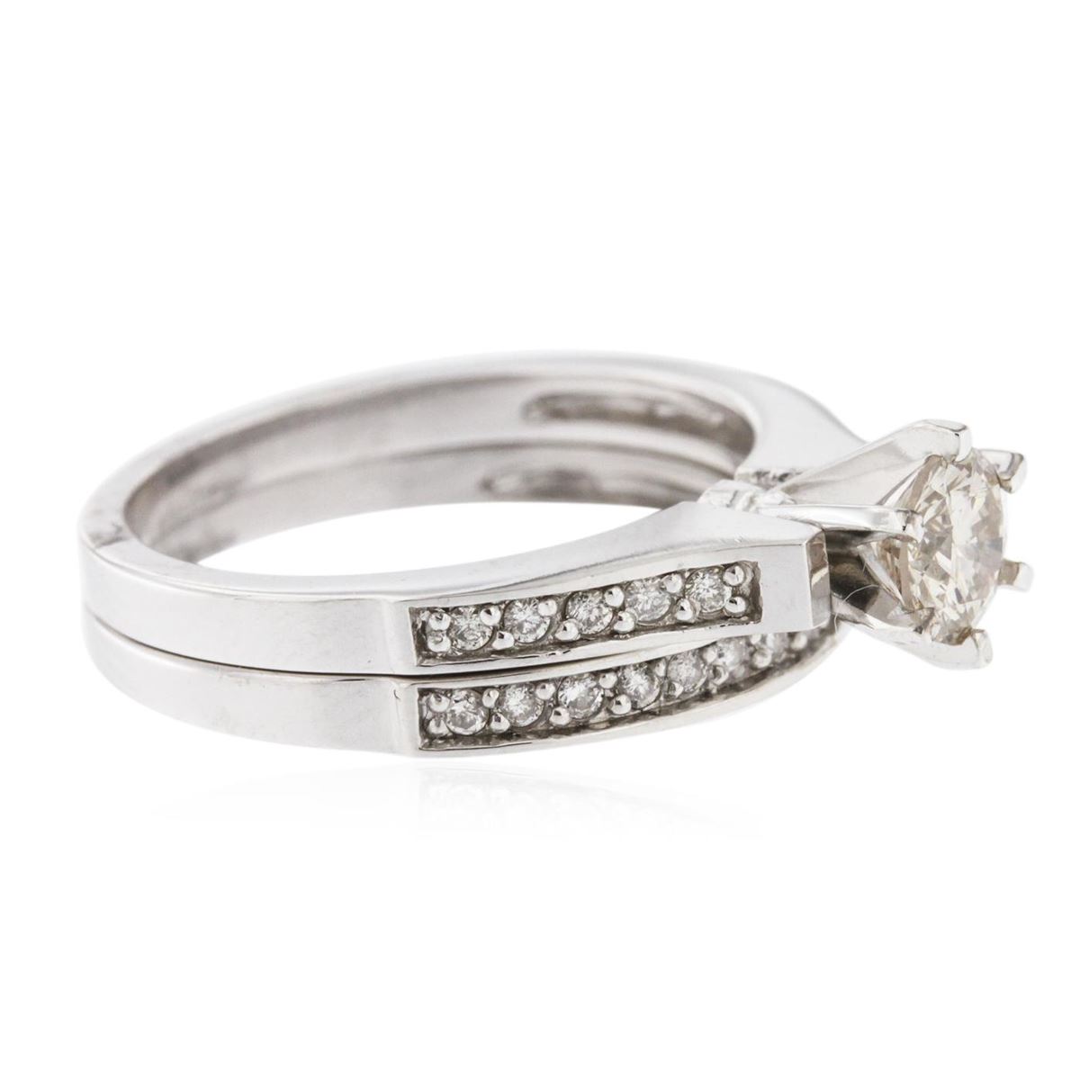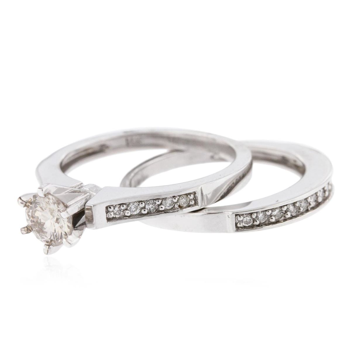 One electronically tested 14KT white gold ladies cast diamond engagement ring & wedding band with a bright polish finish. Identified with markings of "14K". Condition is new. Containing: One prong set round brilliant cut diamond, measuring 5.20 - 5.20 x 3.12mm (depth est.) approximate weight of 0.52ct. Clarity: SI-2, Cut is Good. Twenty-Four prong set round brilliant cut diamonds, measuring 1.30 - 1.30 x 0.78mm (depth est.) approximate total weight of 24 Stones = 0.19ct. Clarity: SI-1 to SI-2. Color: I - J. All diamonds are graded in the mounting, unless otherwise stated. Total Weight of Diamonds 0.71ct. Total Weight of Engagement Ring & Wedding Band 5.90 grams. GGL Appraised at $3,705.00.