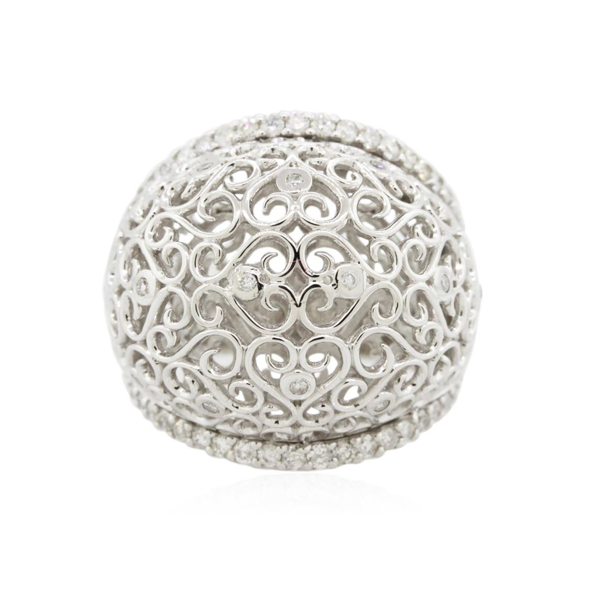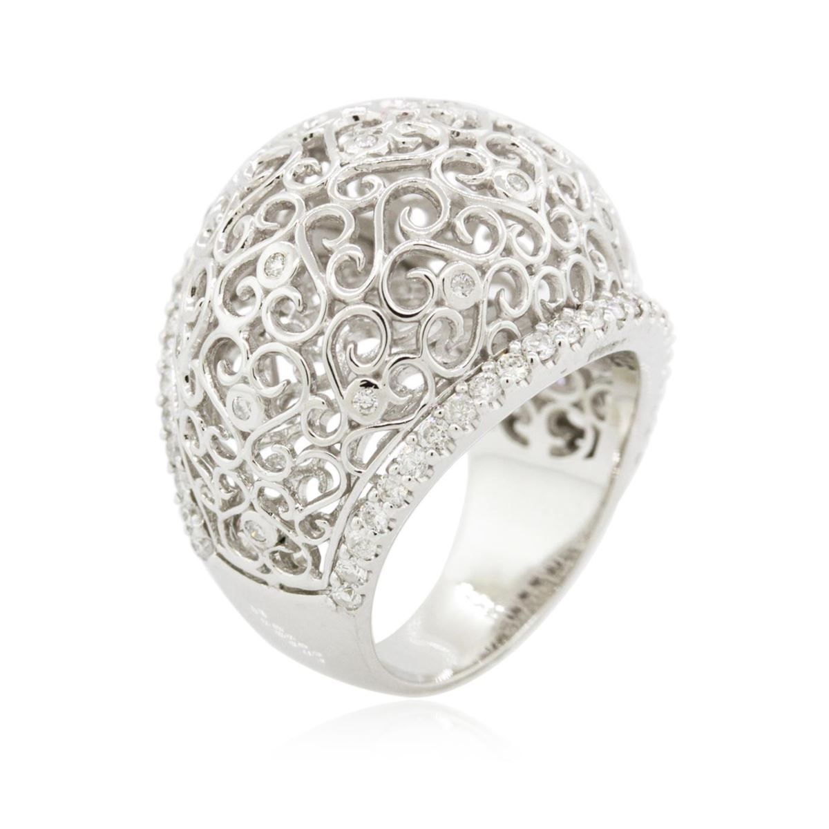 One electronically tested 14KT white gold ladies cast diamond ring with a bright polish finish. Condition is new, good workmanship. The ring features a lattice curvature with diamond accents set within mirroring diamond ribbons, completed by a five and one-half millimeter wide band. Identified with markings of "14K". Containing: Sixty-Eight prong and bezel set round brilliant cut diamonds, measuring 1.50 - 1.20 x 0.81mm (depth est.) approximate. Total Weight of 68 Stones = 0.71ct. Graded in the setting. Clarity: I-1 to I-2. Color: G - I. Total Weight of Diamonds 0.71ct. Total Weight of Ring 11.57gm. AIG Appraised at $4,130.00.