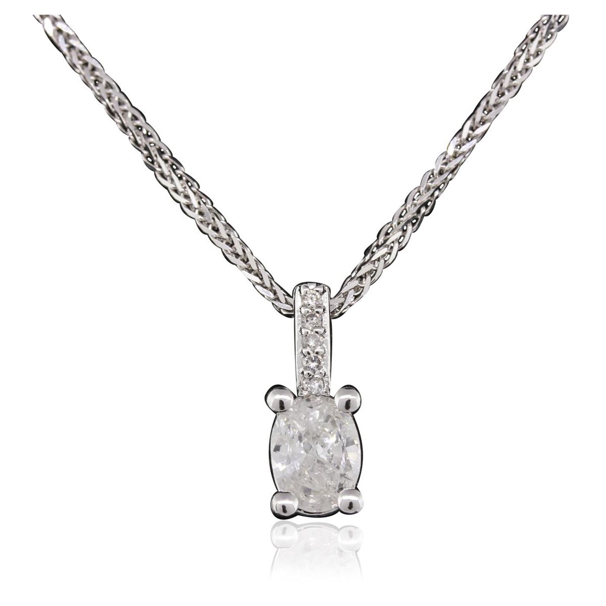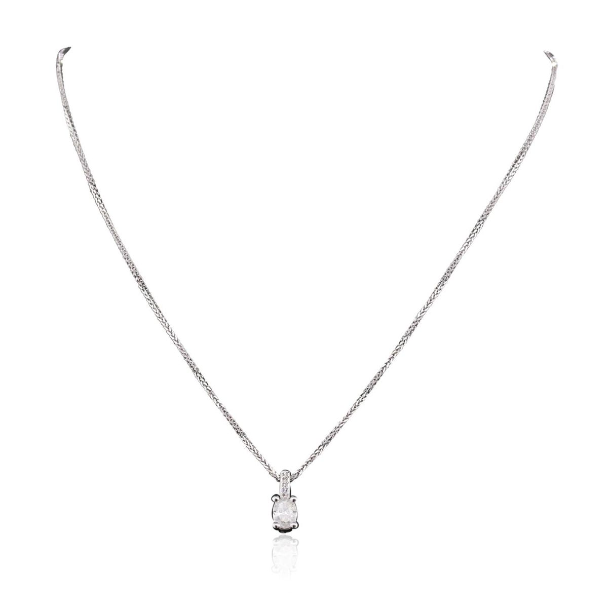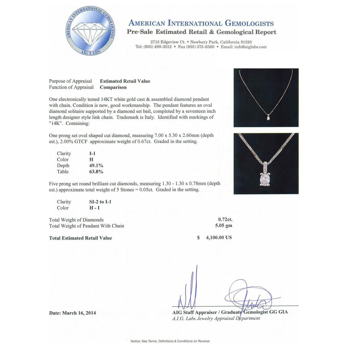 One electronically tested 14KT white gold cast & assembled diamond pendant with chain. Condition is new, good workmanship. The pendant features an oval diamond solitaire supported by a diamond set bail, completed by a seventeen inch length designer style link chain. Trademark is Italy. Identified with markings of "14K". Containing: One prong set oval shaped cut diamond, measuring 7.00 x 5.30 x 2.60mm (depth est.), 2.00.%. GTCF approximate weight of 0.67ct. Graded in the setting. Clarity: I-1. Color: H Depth 49.1%. Table 63.8%. Five prong set round brilliant cut diamonds, measuring 1.30 - 1.30 x 0.78mm (depth est.) approximate. Total Weight of 5 Stones = 0.05ct. Graded in the setting. Clarity: SI-2 to I-1. Color: H - I. Total Weight of Diamonds 0.72ct. Total Weight of Pendant With Chain 5.05 grams. AIG Appraised at $4,100.00.