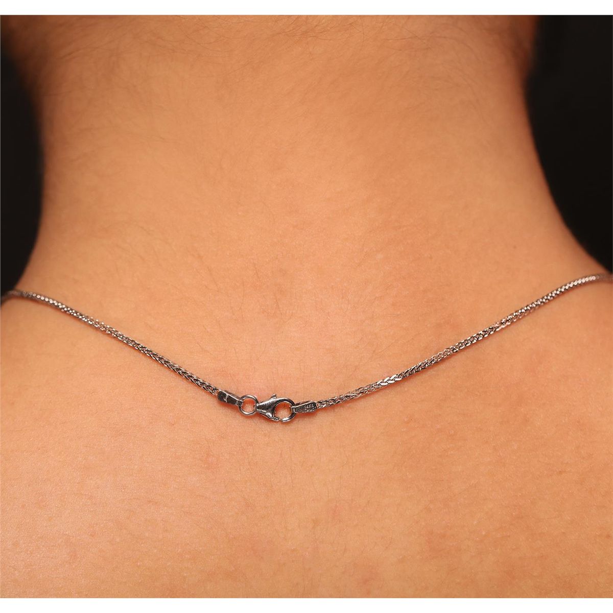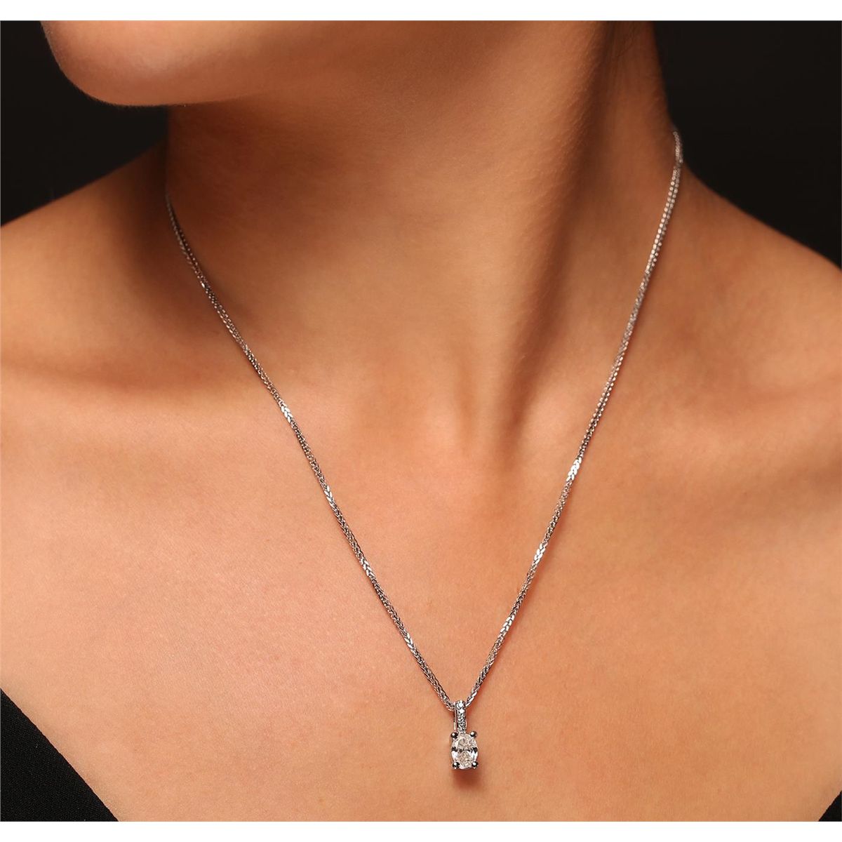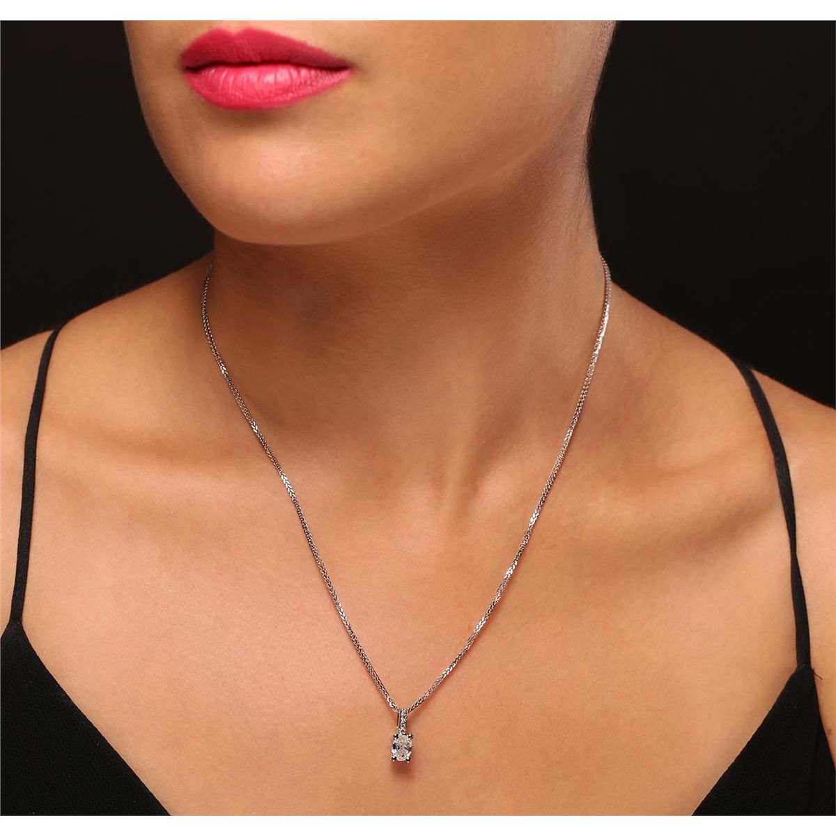 One electronically tested 14KT white gold cast & assembled diamond pendant with chain. Condition is new, good workmanship. The pendant features an oval diamond solitaire supported by a diamond set bail, completed by a seventeen inch length designer style link chain. Trademark is Italy. Identified with markings of "14K". Containing: One prong set oval shaped cut diamond, measuring 7.00 x 5.30 x 2.60mm (depth est.), 2.00.%. GTCF approximate weight of 0.67ct. Graded in the setting. Clarity: I-1. Color: H Depth 49.1%. Table 63.8%. Five prong set round brilliant cut diamonds, measuring 1.30 - 1.30 x 0.78mm (depth est.) approximate. Total Weight of 5 Stones = 0.05ct. Graded in the setting. Clarity: SI-2 to I-1. Color: H - I. Total Weight of Diamonds 0.72ct. Total Weight of Pendant With Chain 5.05 grams. AIG Appraised at $4,100.00.