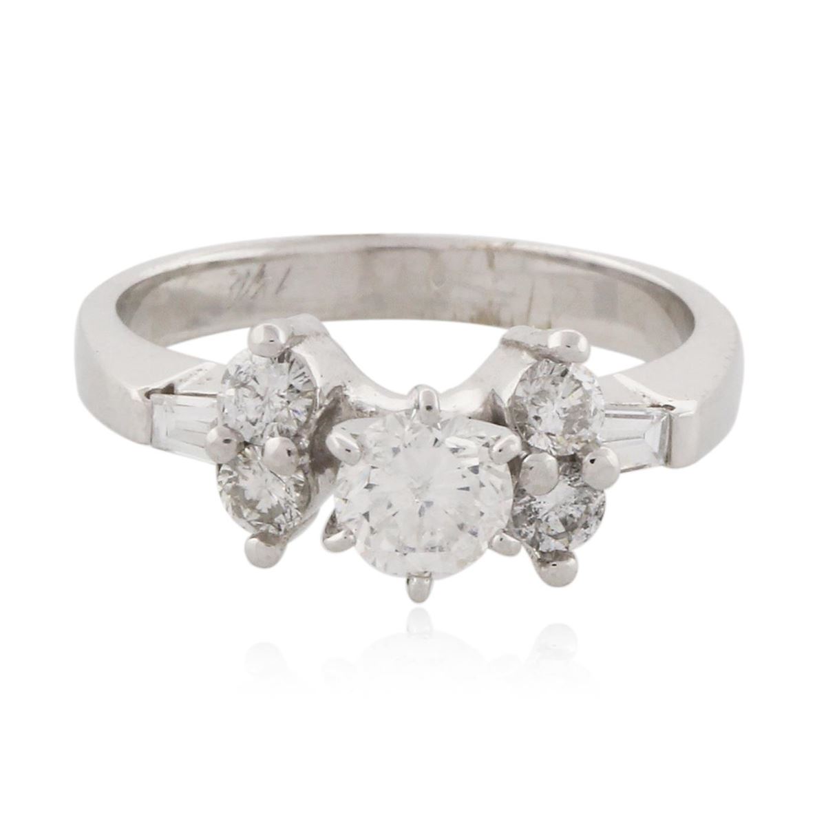 One electronically tested 14KT white gold ladies cast diamond engagement ring with a bright polish finish. Identified with markings of "14K". Condition is new. Containing: One prong set round brilliant cut diamond, measuring 4.90 - 4.90 x 2.94mm (depth est.) approximate weight of 0.43ct. Clarity: SI-2. Color: H, Cut is Good. Four prong set round brilliant cut diamonds, measuring 2.50 - 2.50 x 1.50mm (depth est.) approximate total weight of 4 Stones = 0.23ct. Clarity: I-1. Color: H - I, Cut is Good. Two prong set baguette cut diamonds, measuring 2.80 x 1.30 x 1.11mm (depth est.) approximate total weight of 2 Stones = 0.07ct. Clarity: VS-2. Color: I, Cut is Good. All diamonds are graded in the mounting, unless otherwise stated. Total Weight of Diamonds 0.73ct. Total Weight of Engagement Ring 3.70 grams. GGL Appraised at $3,960.00.