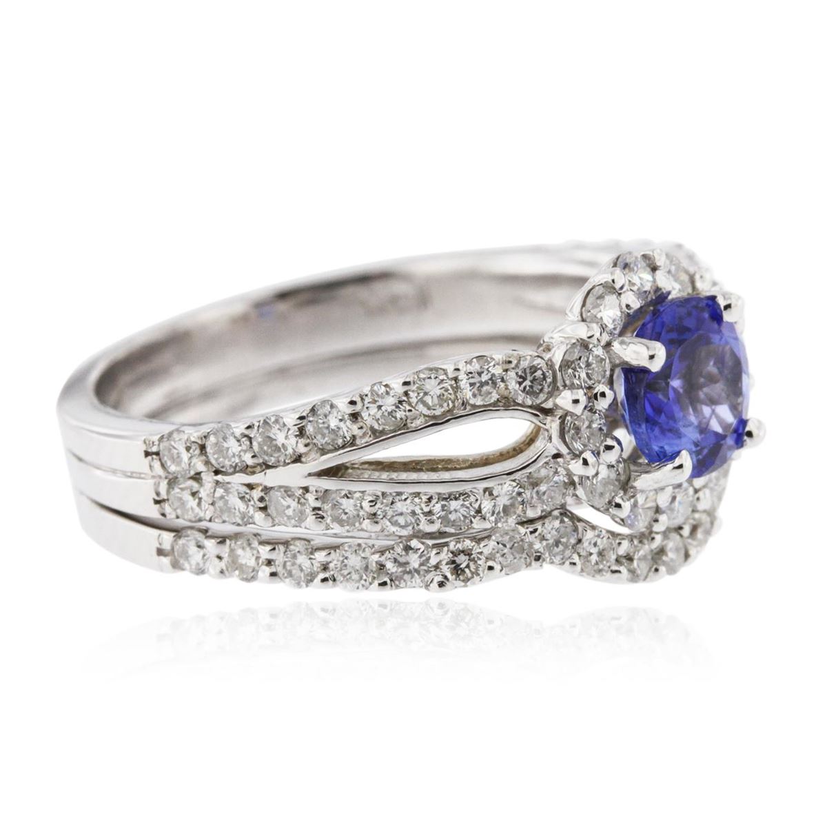 One electronically tested 14KT white gold ladies cast tanzanite and diamond engagement ring & guard set with a bright polish finish. Identified with markings of "14K". Condition is new. Containing: One prong set round modified brilliant cut natural tanzanite, measuring 5.50 - 5.50 x 3.58 mm, approximate weight of 0.73ct., clarity is eye clean, type I, medium, moderately strong, bluish violet color, (GIA bV 5/4), cut is good. Sixty-Five prong set round brilliant cut diamonds, measuring 1.30 - 1.30 x 0.78mm (depth est.) approximate total weight of 65 Stones = 0.52ct. Clarity: SI-2 to I-2. Color: I - J. Colored gemstones are presumed to have been subjected to commonly used enhancement processes. All diamonds and colored gemstones are graded in the mounting, unless otherwise stated. Total Weight of Colored Stones 0.73ct. Total Weight of Diamonds 0.52ct. Total Weight of Engagement Ring & Guard Set 5.40 grams. GGL Appraised at $3,765.00.