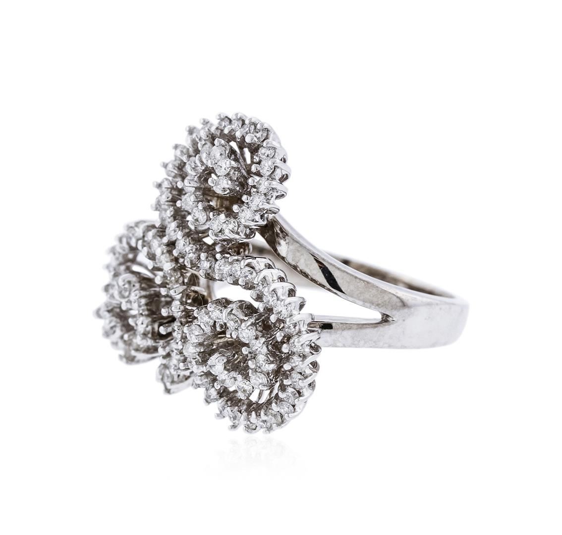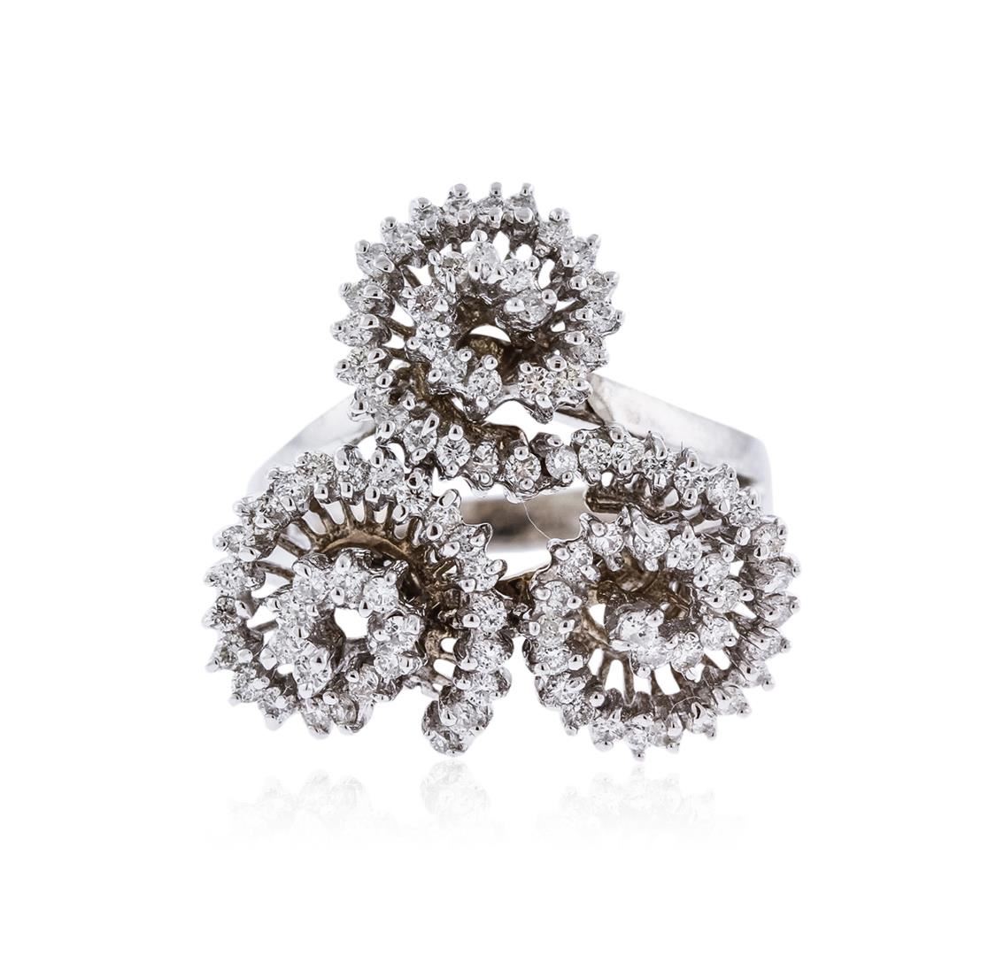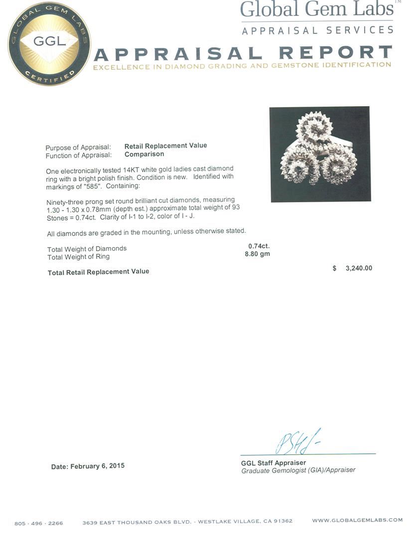 One electronically tested 14KT white gold ladies cast diamond ring with a bright polish finish. Identified with markings of "585". Condition is new. Containing: Ninety-Three prong set round brilliant cut diamonds, measuring 1.30 - 1.30 x 0.78mm (depth est.) approximate total weight of 93 Stones = 0.74ct. Clarity: I-1 to I-2. Color: I - J. All diamonds are graded in the mounting, unless otherwise stated. Total Weight of Diamonds 0.74ct. Total Weight of Ring 8.80 grams. GGL Appraised at $3,240.00.