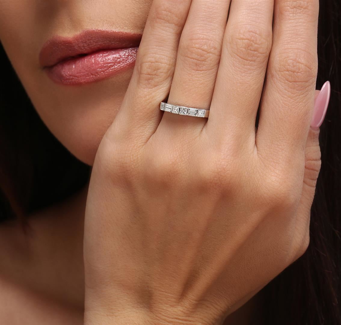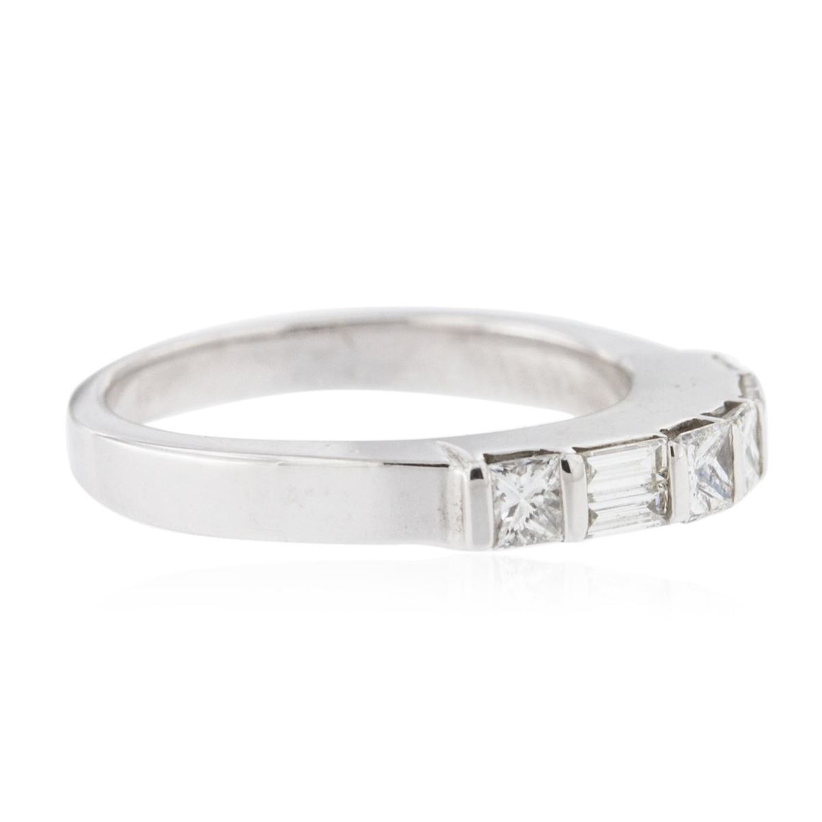 One ring featuring: 14KT white gold weighing 3.70 grams containing channel set princess and baguette cut diamonds with a total weight of 0.75ct.