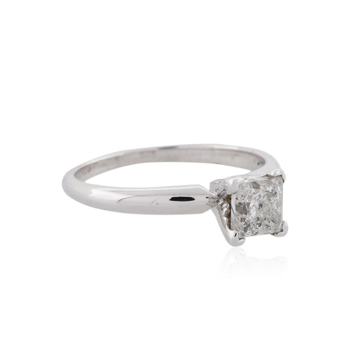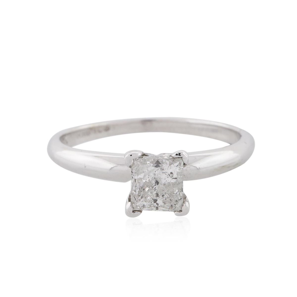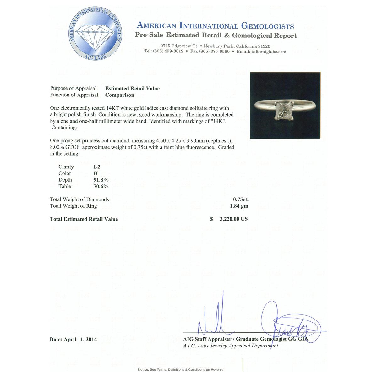 One electronically tested 14KT white gold ladies cast diamond solitaire ring with a bright polish finish. Condition is new, good workmanship. The ring is completed by a one and one-half millimeter wide band. Identified with markings of "14K". Containing: One prong set princess cut diamond, measuring 4.50 x 4.25 x 3.90mm (depth est.), 8.00.%. GTCF approximate weight of 0.75ct with a faint blue fluorescence. Graded in the setting. Clarity: I-2. Color: 91.8%. Table 70.6%. Total Weight of Diamonds 0.75ct. Total Weight of Ring 1.84 grams. AIG Appraised at $3,220.00.