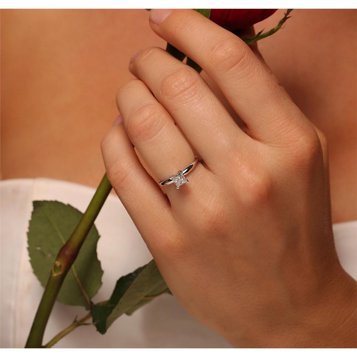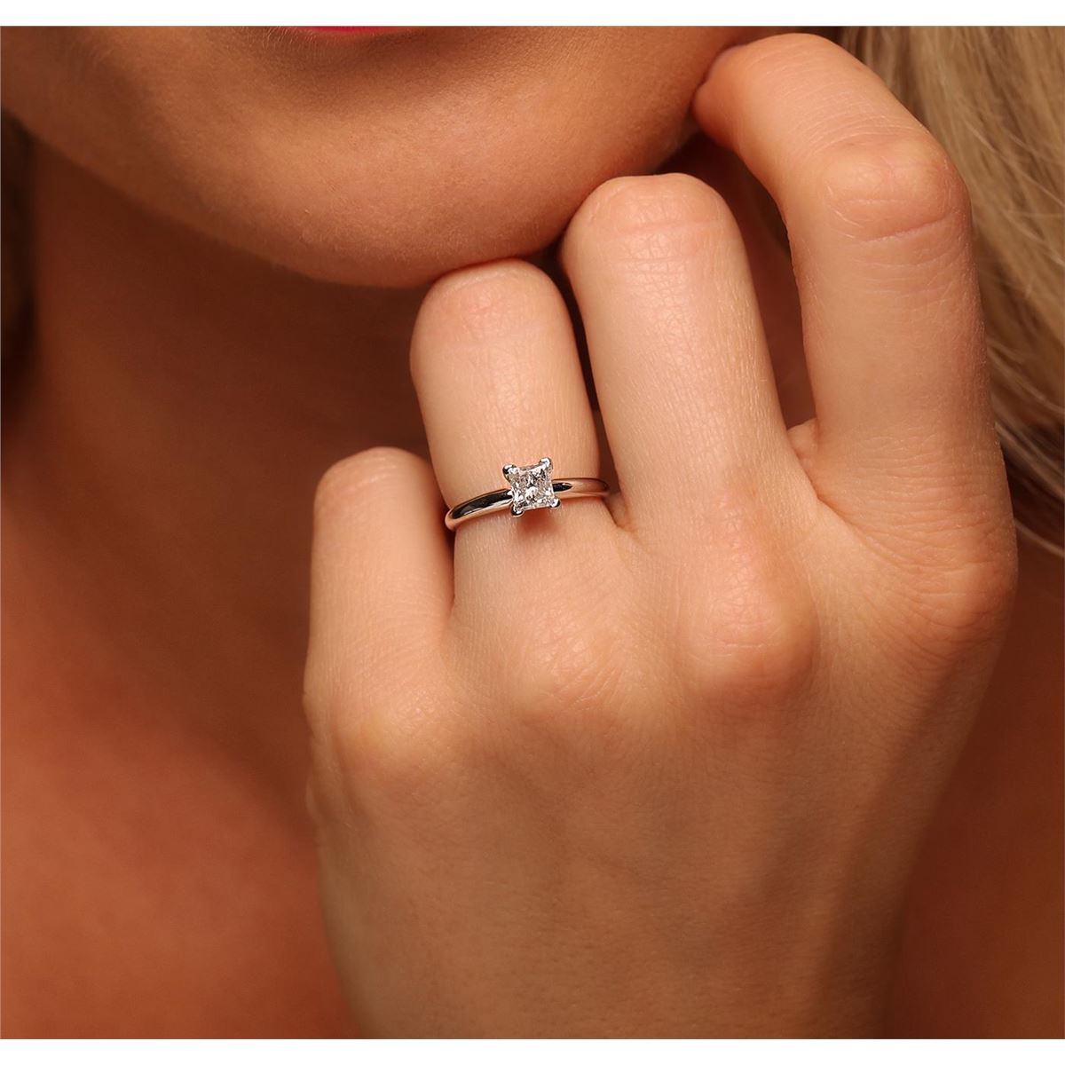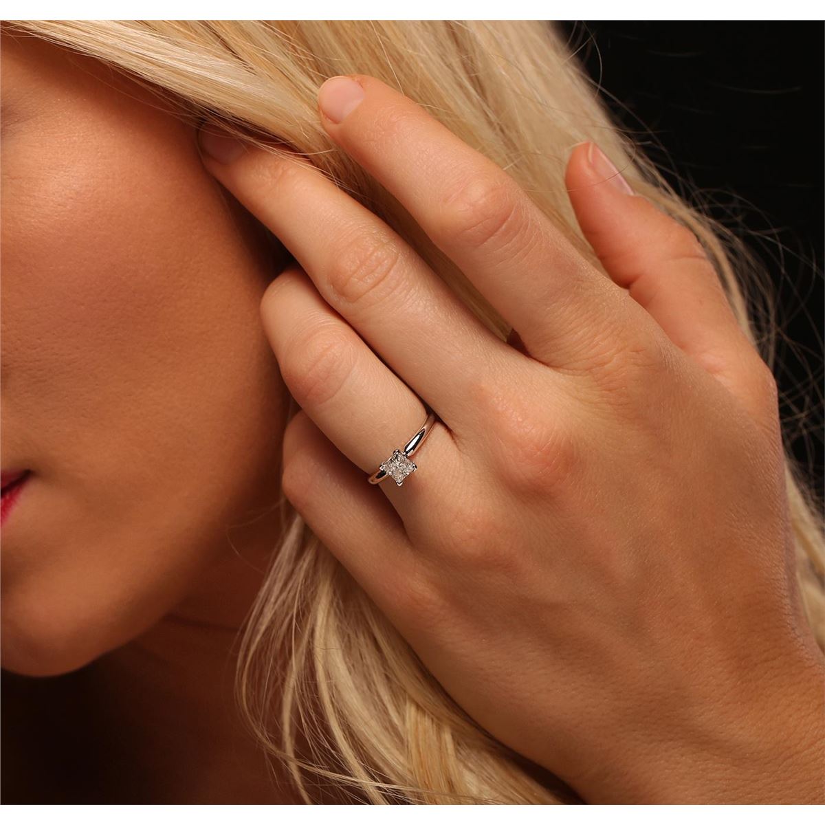 One electronically tested 14KT white gold ladies cast diamond solitaire ring with a bright polish finish. Condition is new, good workmanship. The ring is completed by a one and one-half millimeter wide band. Identified with markings of "14K". Containing: One prong set princess cut diamond, measuring 4.50 x 4.25 x 3.90mm (depth est.), 8.00.%. GTCF approximate weight of 0.75ct with a faint blue fluorescence. Graded in the setting. Clarity: I-2. Color: 91.8%. Table 70.6%. Total Weight of Diamonds 0.75ct. Total Weight of Ring 1.84 grams. AIG Appraised at $3,220.00.