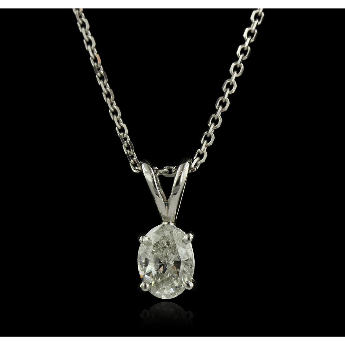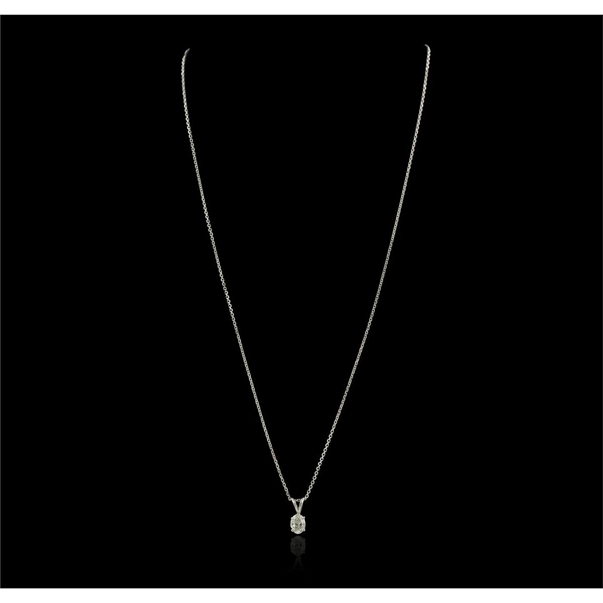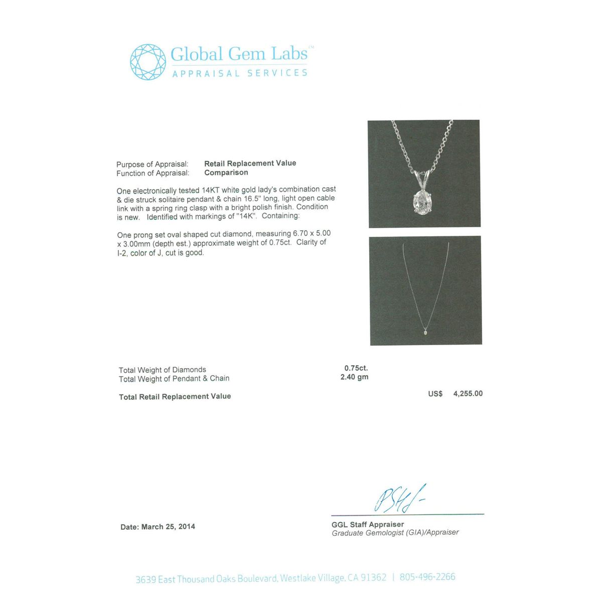 One electronically tested 14KT white gold Ladies combination cast & die struck solitaire pendant & chain 16.5" long, light open cable link with a spring ring clasp with a bright polish finish. Condition is new. Identified with markings of "14K". Containing: One prong set oval shaped cut diamond, measuring 6.70 x 5.00 x 3.00mm (depth est.) approximate weight of 0.75ct. Clarity: I-2. Color: J, Cut is Good. Total Weight of Diamonds 0.75ct. Total Weight of Pendant & Chain 2.40 grams. GGL Appraised at $4,255.00.