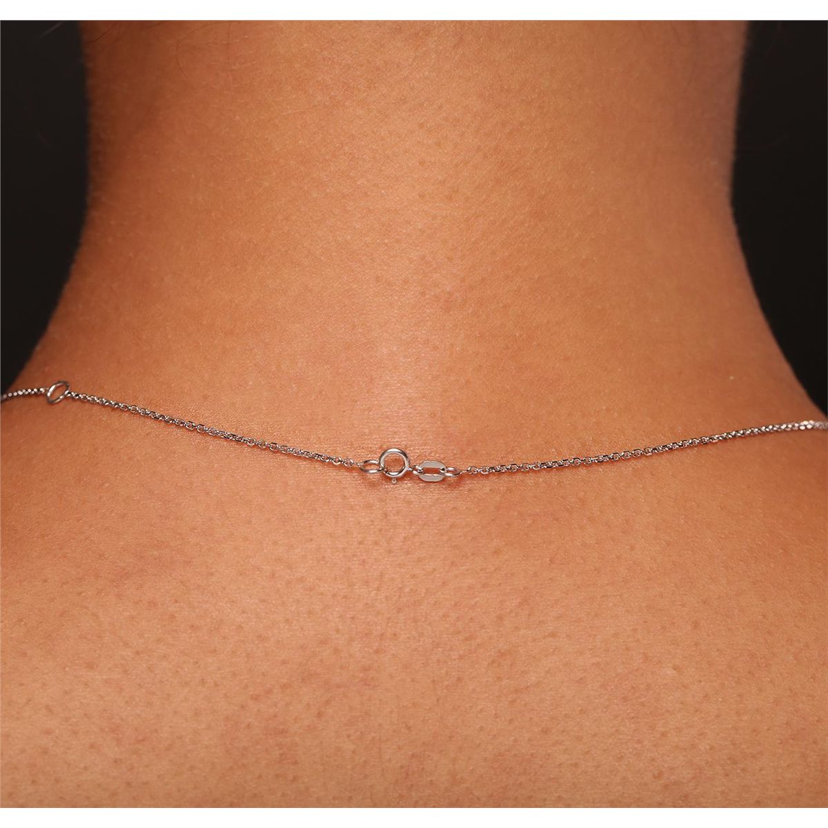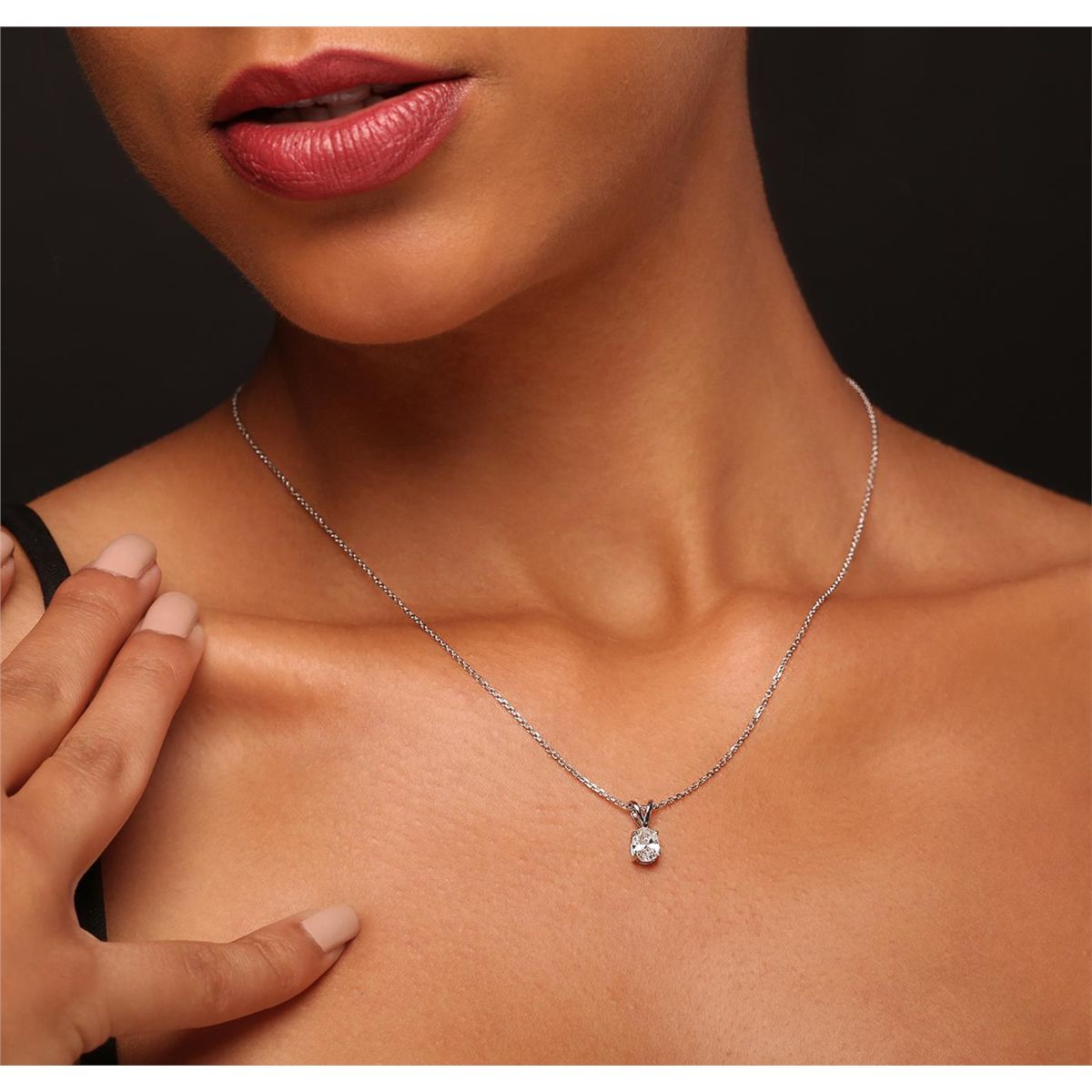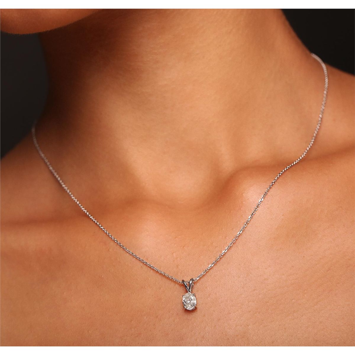 One electronically tested 14KT white gold Ladies combination cast & die struck solitaire pendant & chain 16.5" long, light open cable link with a spring ring clasp with a bright polish finish. Condition is new. Identified with markings of "14K". Containing: One prong set oval shaped cut diamond, measuring 6.70 x 5.00 x 3.00mm (depth est.) approximate weight of 0.75ct. Clarity: I-2. Color: J, Cut is Good. Total Weight of Diamonds 0.75ct. Total Weight of Pendant & Chain 2.40 grams. GGL Appraised at $4,255.00.