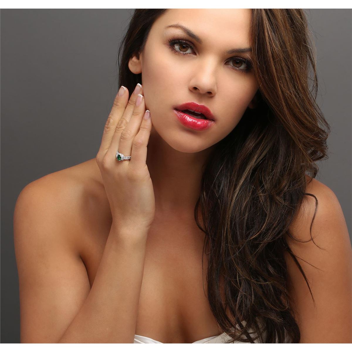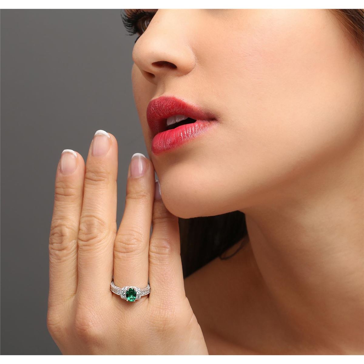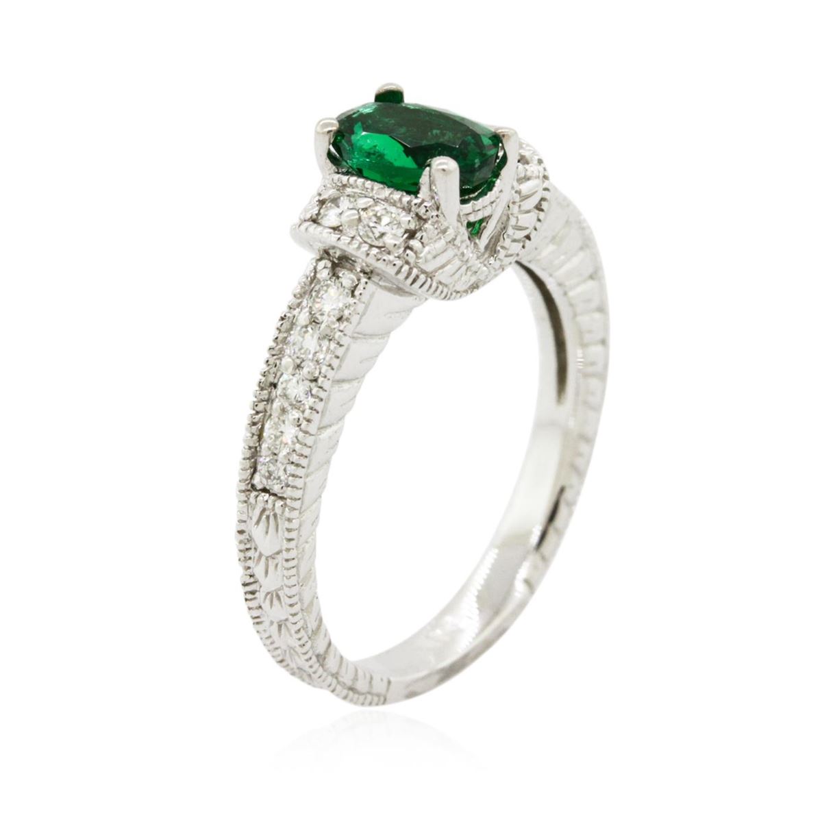 One electronically tested 14KT white gold ladies cast emerald and diamond ring. The featured emerald is set within mirroring diamond ribbons supported by diamond set shoulders, completed by a two and one-half millimeter wide band. Bright and patterned finish with milgrain detailing throughout. Identified with markings of "14K". Condition is new, good workmanship. Containing: One prong set oval mixed cut natural emerald, measuring 7.10 x 5.30 x 3.05mm, approximate weight of 0.75ct., clarity is slightly included, type III, dark, moderately strong, very slightly bluish green color, (GIA vslbG 7/4), cut is good. Transmitting light with a minimum of distortion, transparent. Naturally occurring internal & external characteristics are present. Refractive index testing results of 1.57 to 1.58. This is a conclusive result for beryl (emerald). Graded in the setting. Fourteen prong set round brilliant cut diamonds, measuring 2.00 - 1.80 x 1.14mm (depth est.) approximate total weight of 14 Stones = 0.40ct. Graded in the setting. Clarity: VS-1 to SI-1. Color: F - H. Total Weight of Colored Stones 0.75ct. Total Weight of Diamonds 0.40ct. Total Weight of Ring 4.87 grams. AIG Appraised at $4,220.00.