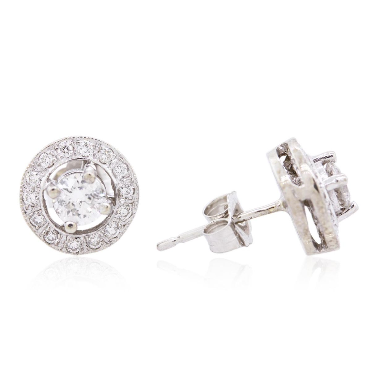 One pair of earrings featuring: 14KT white gold weighing 2.70 grams containing two round cut diamond center stones with a total weight of 0.55cts and round cut diamond side stones with a total weight of 0.20cts.