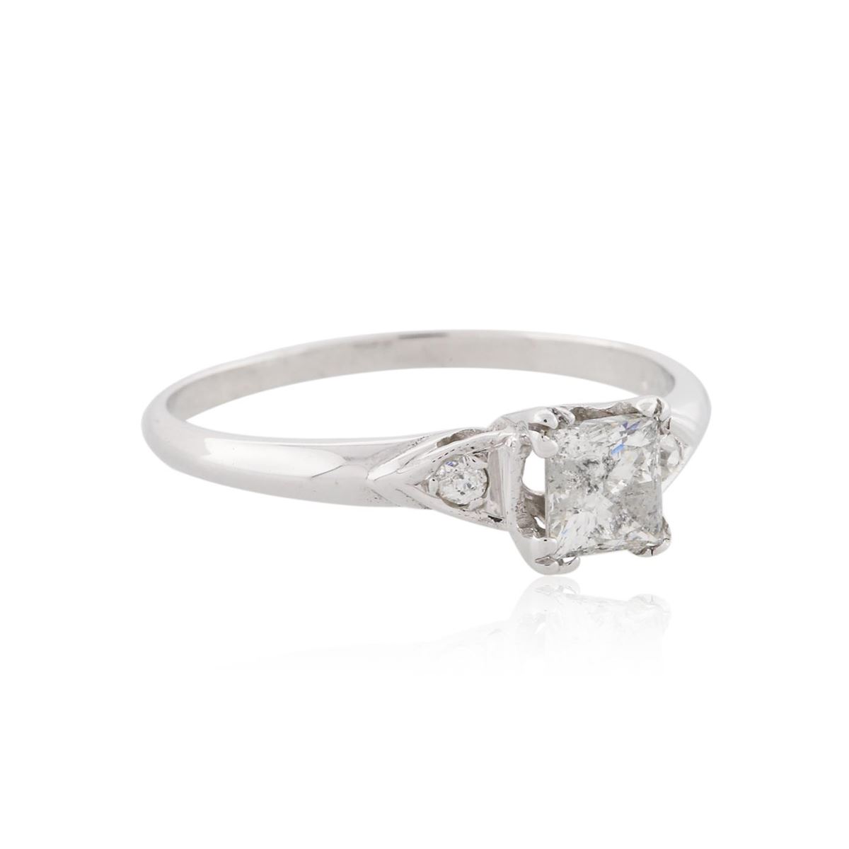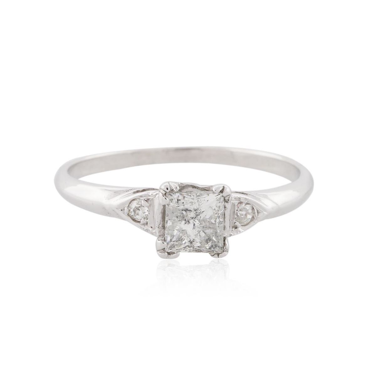 One electronically tested 14KT white gold ladies cast diamond unity ring with a bright polish finish. Condition is new, good workmanship. The featured diamond is accented by a single diamond on either side, completed by a one and one-half millimeter wide band. Identified with markings of "14K". Containing: One prong set princess cut diamond, measuring 4.60 x 4.35 x 3.40mm (depth est.), 10.00.%. GTCF approximate weight of 0.70ct with a faint blue fluorescence. Graded in the setting. Clarity: I-1. Color: 78.2%. Table 75.9%. Two prong set Old European cut diamonds, measuring 1.80 - 1.80 x 1.12mm (depth est.) approximate. Total Weight of 2 Stones = 0.06ct. Cutting style circa late 19th century. Graded in the setting. Clarity: SI-1 to SI-2. Color: H - I. Total Weight of Diamonds 0.76ct. Total Weight of Ring 1.94 grams. AIG Appraised at $4,595.00.