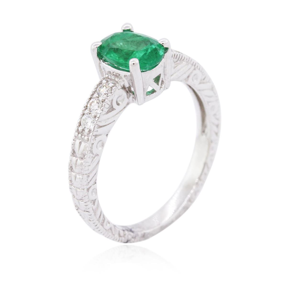 One electronically tested 14KT white gold ladies combination cast & assembled emerald and diamond ring with a flat shank with a bright polish finish. Condition is new. Containing: One prong set oval modified cut natural emerald, measuring 7.27 x 5.27 x 3.48mm, approximate weight of 0.76ct., clarity is moderately included, type III, medium, moderately strong, green color, (GIA G 5/4), cut is good. Six prong set round brilliant cut diamonds, measuring 1.60 - 1.60 x 0.96mm (depth est.) approximate total weight of 6 Stones = 0.09ct. Clarity: SI-1 to SI-2. Color: I - J, Cut is Good. All diamonds and colored gemstones are graded in the mounting, unless otherwise stated. Colored gemstones are presumed to have been subjected to commonly used enhancement processes. Total Weight of Colored Stones 0.76ct. Total Weight of Diamonds 0.09ct. Total Weight of Ring 3.40 grams. GGL Appraised at $4,260.00.