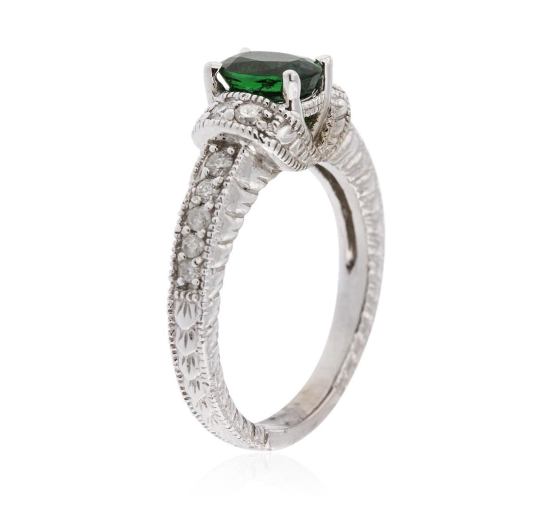 One electronically tested 14KT white gold ladies cast garnet and diamond ring with a bright polish finish. Identified with markings of "14K". Condition is new. Containing: One prong set oval modified brilliant cut natural tsavorite garnet, measuring 7.00 x 4.70 x 3.06mm, approximate weight of 0.76ct., clarity is eye clean, type II, medium, moderately strong, green color, (GIA G 5/4), cut is good. Fourteen prong set round brilliant cut diamonds, measuring 1.50 - 1.50 x 0.90mm (depth est.) stated. Total Weight of 14 Stones = 0.17ct. Clarity: I-1. Color: H - I. Colored gemstones are presumed to have been subjected to commonly used enhancement processes. All diamonds and colored gemstones are graded in the mounting, unless otherwise stated. Total Weight of Colored Stones 0.76ct. Total Weight of Diamonds 0.17ct. Total Weight of Ring 6.00 grams. GGL Appraised at $3,330.00.