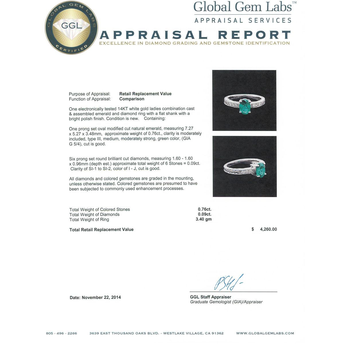 One electronically tested 14KT white gold ladies combination cast & assembled emerald and diamond ring with a flat shank with a bright polish finish. Condition is new. Containing: One prong set oval modified cut natural emerald, measuring 7.27 x 5.27 x 3.48mm, approximate weight of 0.76ct., clarity is moderately included, type III, medium, moderately strong, green color, (GIA G 5/4), cut is good. Six prong set round brilliant cut diamonds, measuring 1.60 - 1.60 x 0.96mm (depth est.) approximate total weight of 6 Stones = 0.09ct. Clarity: SI-1 to SI-2. Color: I - J, Cut is Good. All diamonds and colored gemstones are graded in the mounting, unless otherwise stated. Colored gemstones are presumed to have been subjected to commonly used enhancement processes. Total Weight of Colored Stones 0.76ct. Total Weight of Diamonds 0.09ct. Total Weight of Ring 3.40 grams. GGL Appraised at $4,260.00.