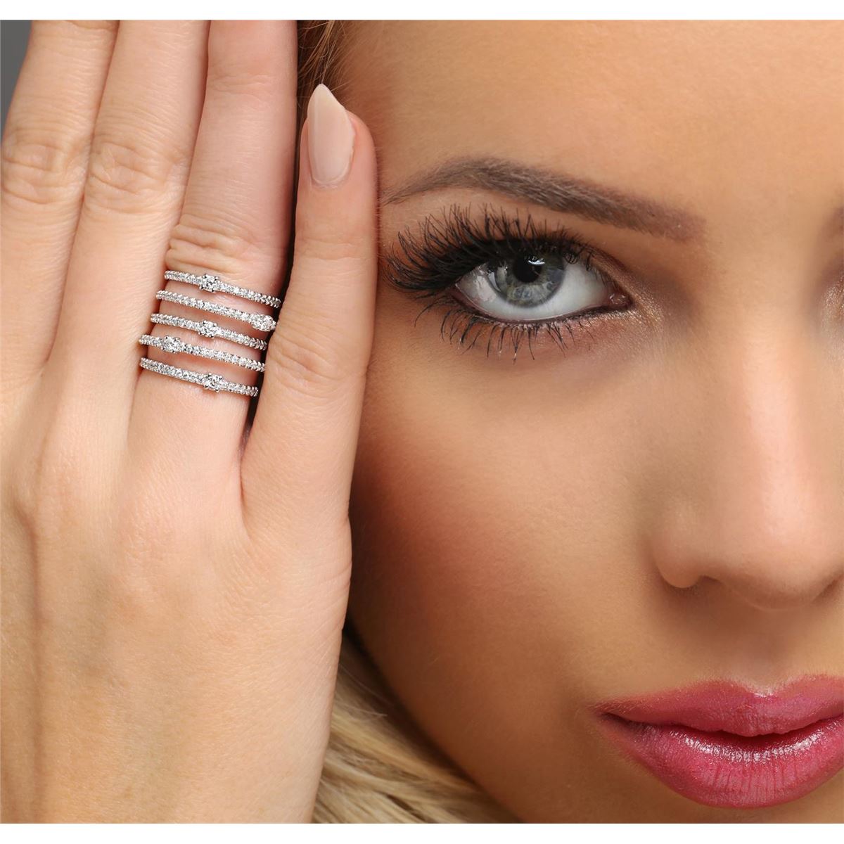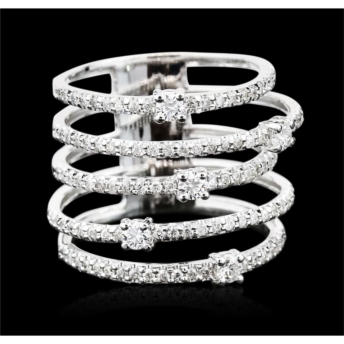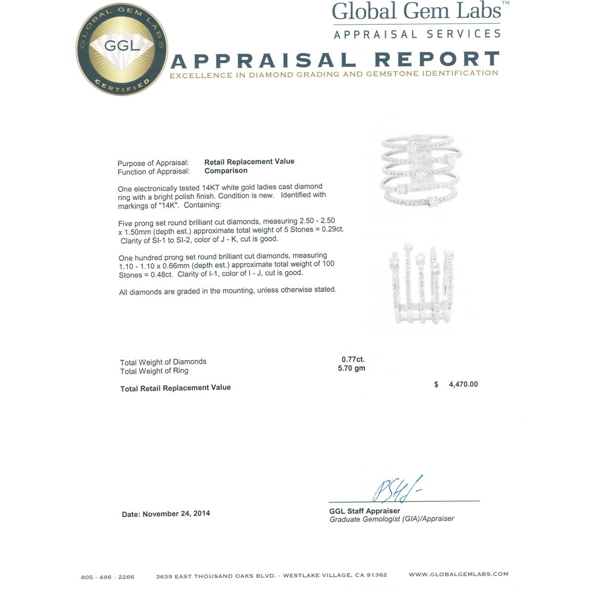One electronically tested 14KT white gold ladies cast diamond ring with a bright polish finish. Identified with markings of "14K". Condition is new. Containing: Five prong set round brilliant cut diamonds, measuring 2.50 - 2.50 x 1.50mm (depth est.) approximate total weight of 5 Stones = 0.29ct. Clarity: SI-1 to SI-2. Color: J - K, Cut is Good. One Hundred prong set round brilliant cut diamonds, measuring 1.10 - 1.10 x 0.66mm (depth est.) approximate total weight of 100 Stones = 0.48ct. Clarity: I-1. Color: I - J, Cut is Good. All diamonds are graded in the mounting, unless otherwise stated. Total Weight of Diamonds 0.77ct. Total Weight of Ring 5.70 grams. GGL Appraised at $4,470.00.